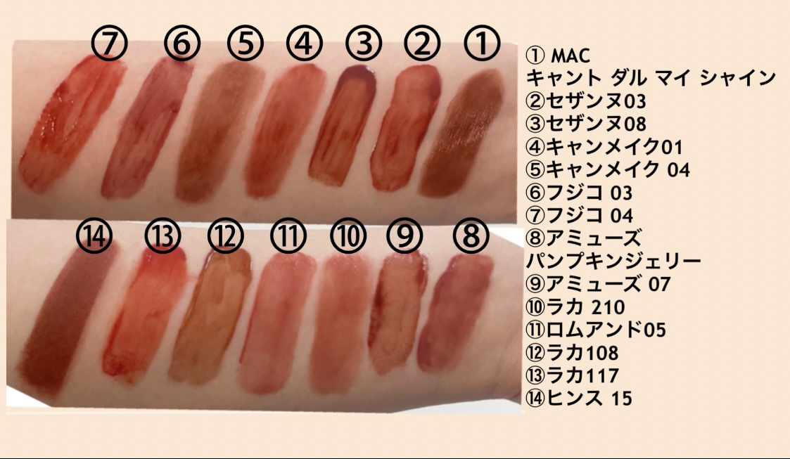 14本のお気に入りリップのスウォッチ🧡 M・A・Cラスターガラス リップスティック キャント ダル マイ シャイン CEZANNEウォータリーティントリップ 03ベージュブラウン08カフェブラウン