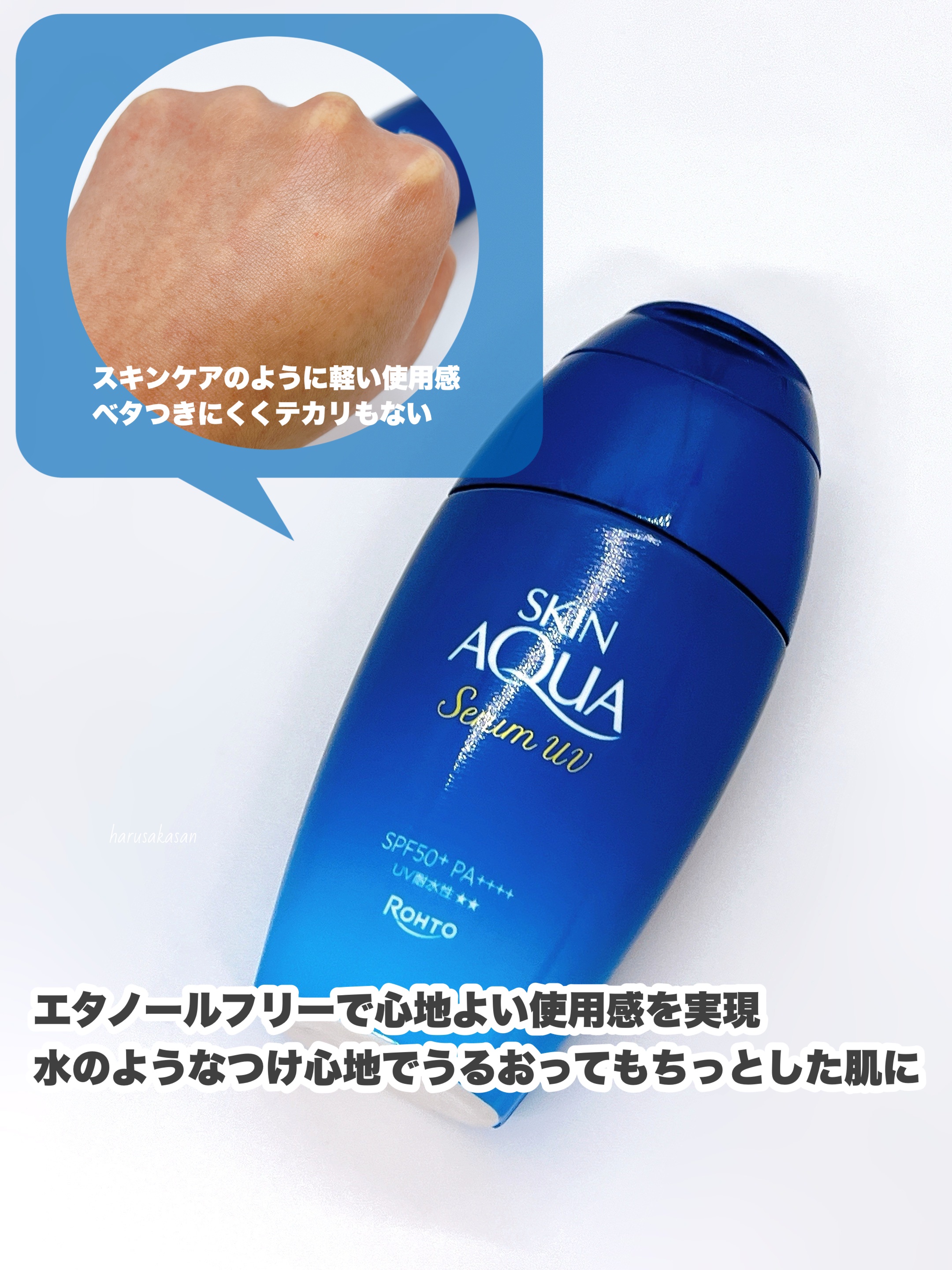 - エタノールフリーで心地よい使用感を実現。最高濃度※1の3種のヒアルロン酸※2配合。 水のようなつけ心地でうるおってもちっとした肌に。 使いやすいワンタッチキャップ。 SPF50+/PA++++/UV耐水性★★。 ※1:スキンアクアシリーズ内において ※2:うるおい成分:ヒアルロン酸Na、超低分子ヒアルロン酸(加水分解ヒアルロン酸Na)、肌吸着型ヒアルロン酸(ヒアルロン酸ヒドロキシプロピルトリモニウム)