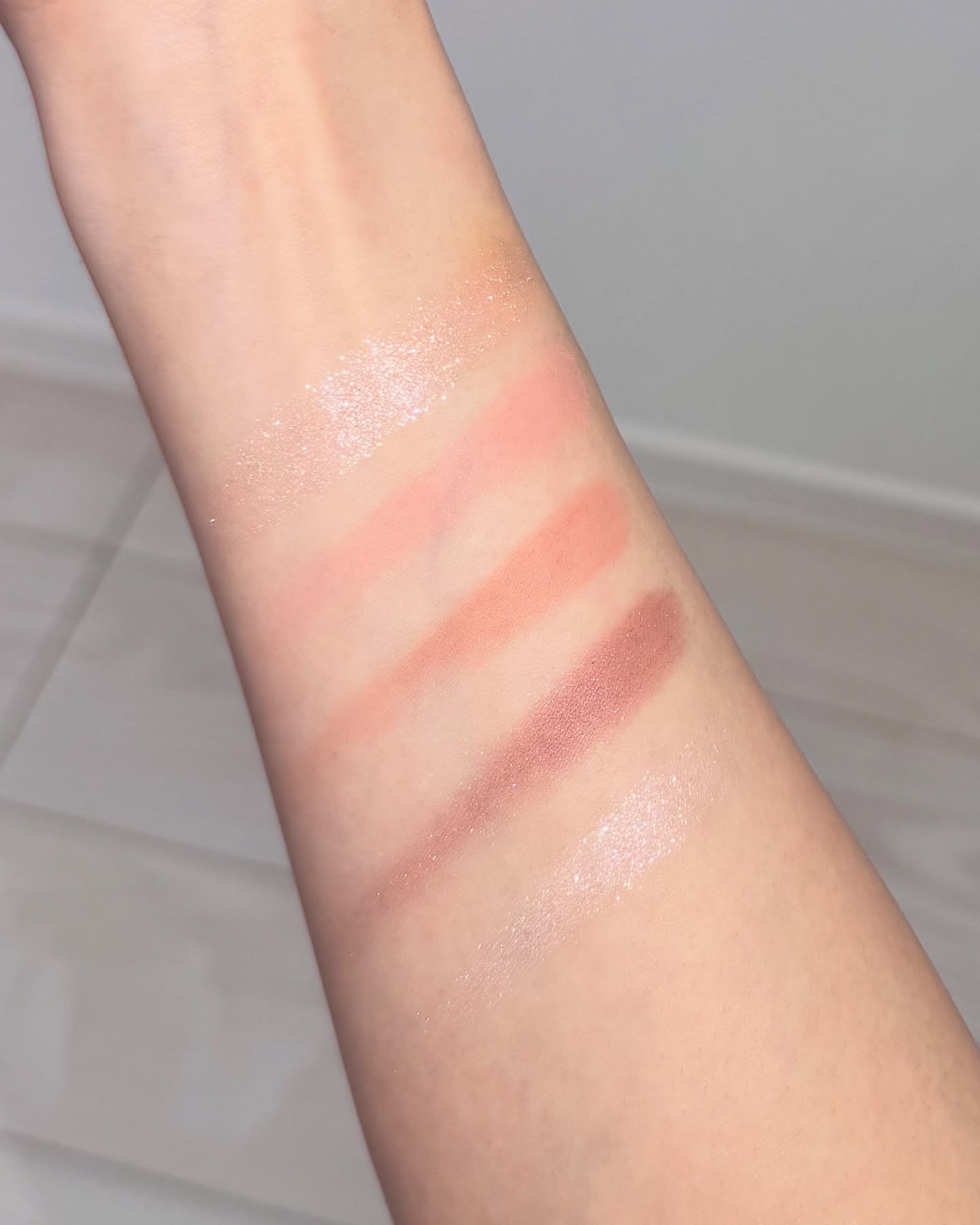 右上のピンクラメをベースに仕込んでメイクしたんだけどツヤと煌めき感えぐすぎる😳💎可愛い、、 そこに右下のカラーを重ねるとじんわり血色感が滲み出るような目元になるよ🦩 これは欠品店舗続出しそう🫣