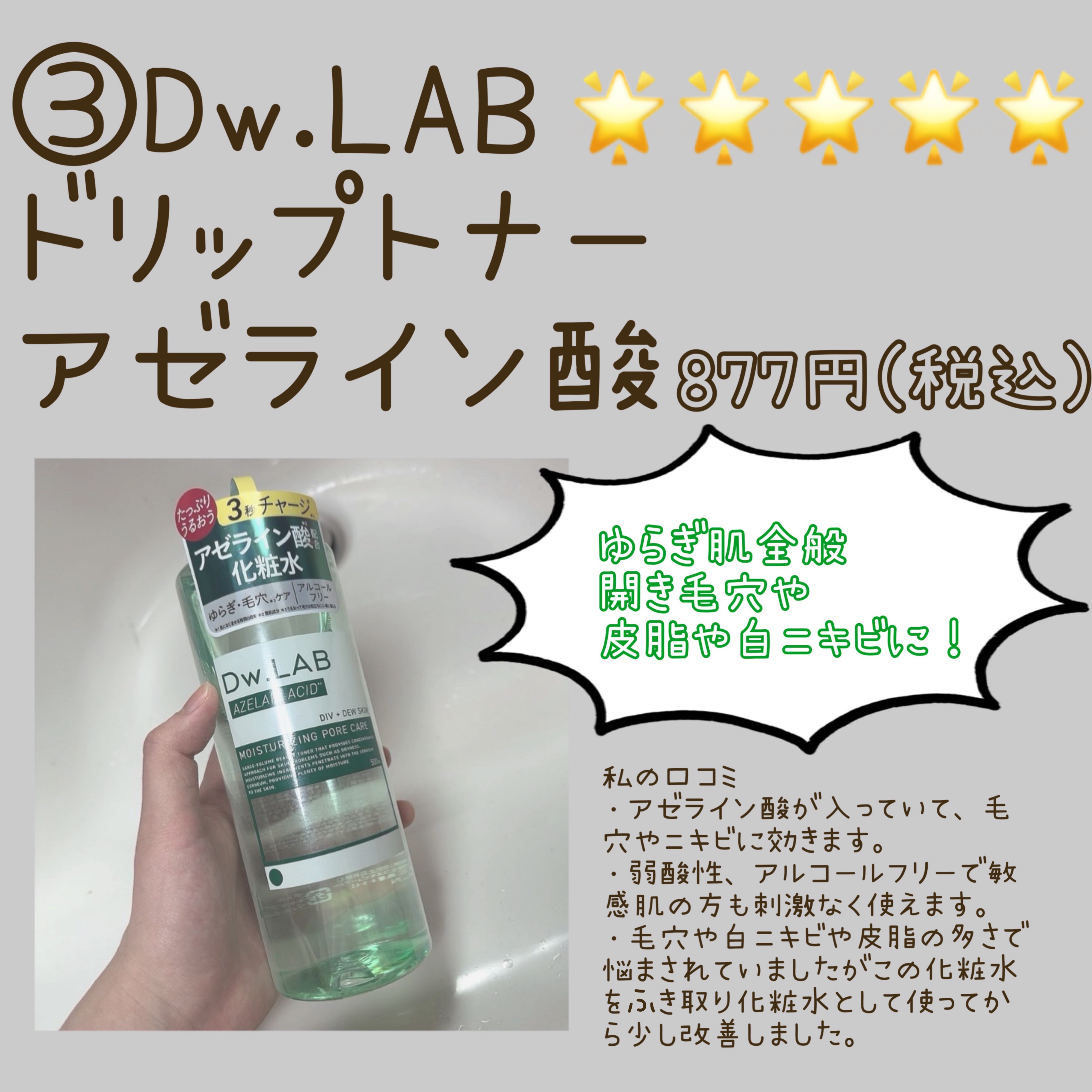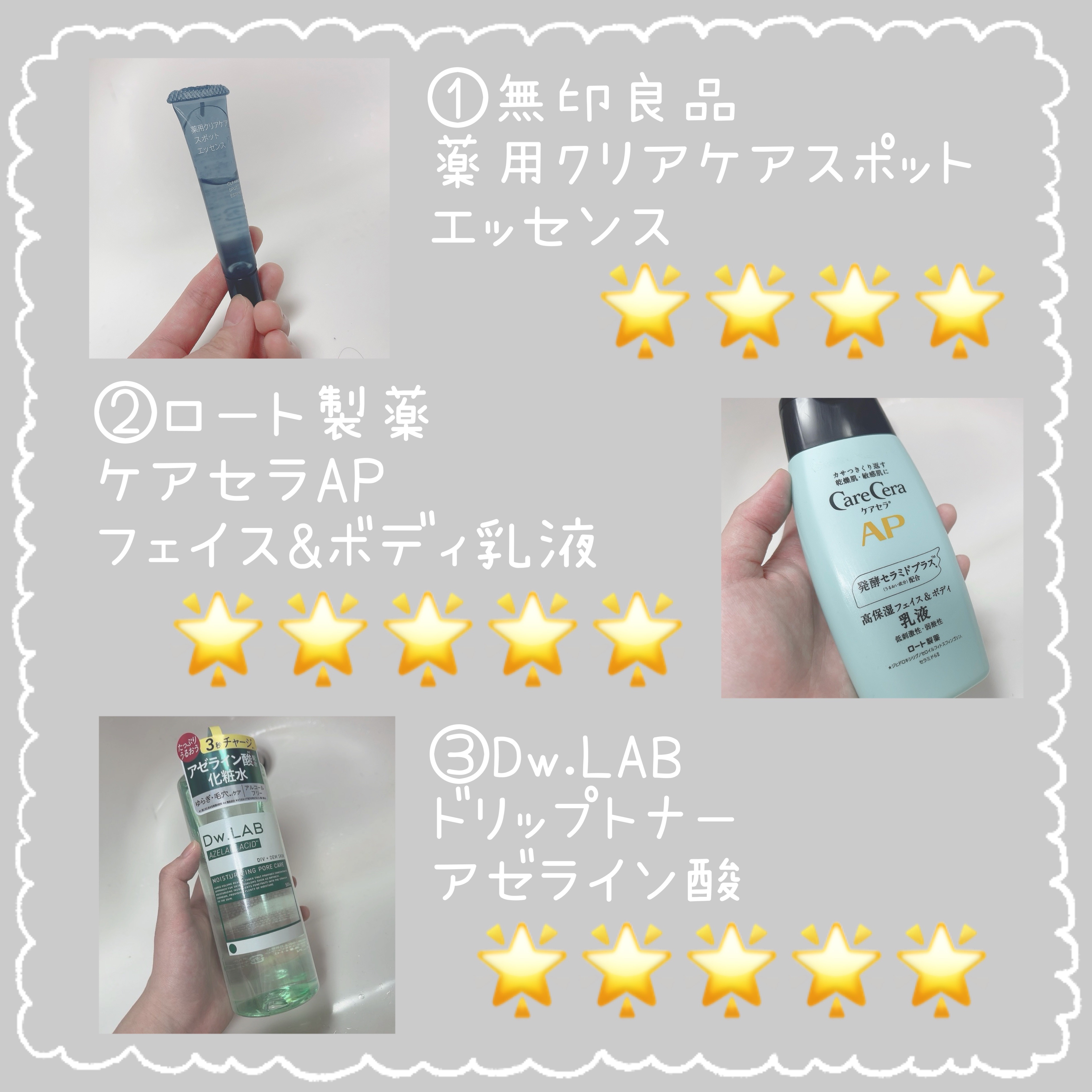 無印良品の薬用クリアケアスポットエッセンス 🔥赤ニキビある人にオススメ🔥 ・有効成分として炎症に効果のあるグリチルリチン酸2K、うるおい成分としてツボクサエキスやブドウ葉エキスなど10種の植物エキスを配合されています。 ロート製薬のケアセラ APフェイス&ボディ乳液 ⛄️乾燥肌の人にオススメ⛄️ ・うるおい成分である発酵セラミドプラスを含む8種の天然型セラミド配合されています。 Dw.LABのドリップトナーアゼライン酸 🤍毛穴や皮脂、白ニキビのある人にオススメ🤍 ・毛穴やゆらぎ肌に効くアゼライン酸が配合されていて、肌のキメをよくするグリシルグリシン配合されている500mlの大容量化粧水です。