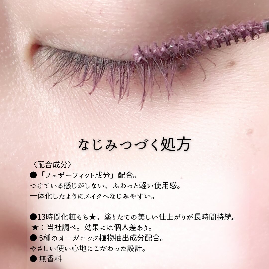 - ●まつ毛パーマをかけたかのような、短いまつ毛もくるんとカールアップしたナチュラルまつ毛が1日持続するフィルムタイプのマスカラです。 1本1本、逃さず塗布することで、自然に際立つまつ毛を叶えます。 ●糸を引くような成分を配合したベースを採用。極細ブラシが短いまつ毛や下まつ毛を逃さずキャッチし、自然と 自まつ毛が美しく伸びたような、ナチュラルでありながらも目力のあるまつ毛を実現します。 ●涙に強い皮膜を形成する 「涙ストロング成分」を配合。時間が経ってもにじみにくく、塗りたての美しい仕上がりが 持続します。 ●かたい皮膜を形成する「パーマネントカール成分」を高配合することにより、しっかりカールをロック。 時間が経っても まつ毛が下がりにくく、塗りたてのカールアップまつ毛をキープします。 ●40°C前後のお湯で皮膜がやわらかくなる 「イージーオフ成分」 を増量して配合。※従来品比 専用クレンジング不要で、お湯で簡単に落とすことができます。 ●目もとにフィットする、 極細スキニーブラシを採用。 なじみつづく処方 ●「フェザーフィット成分」配合。つけている感じがしない、ふわっと軽い使用感。一体化したようにメイクへなじみます。 ●13時間化粧もち塗りたての美しい仕上がりが長時間持続します。★: 当社調べ。効果には個人差があります. ●5種のオーガニック植物抽出成分配合。 やさしい使い心地にこだわった設計です。 ●無香料