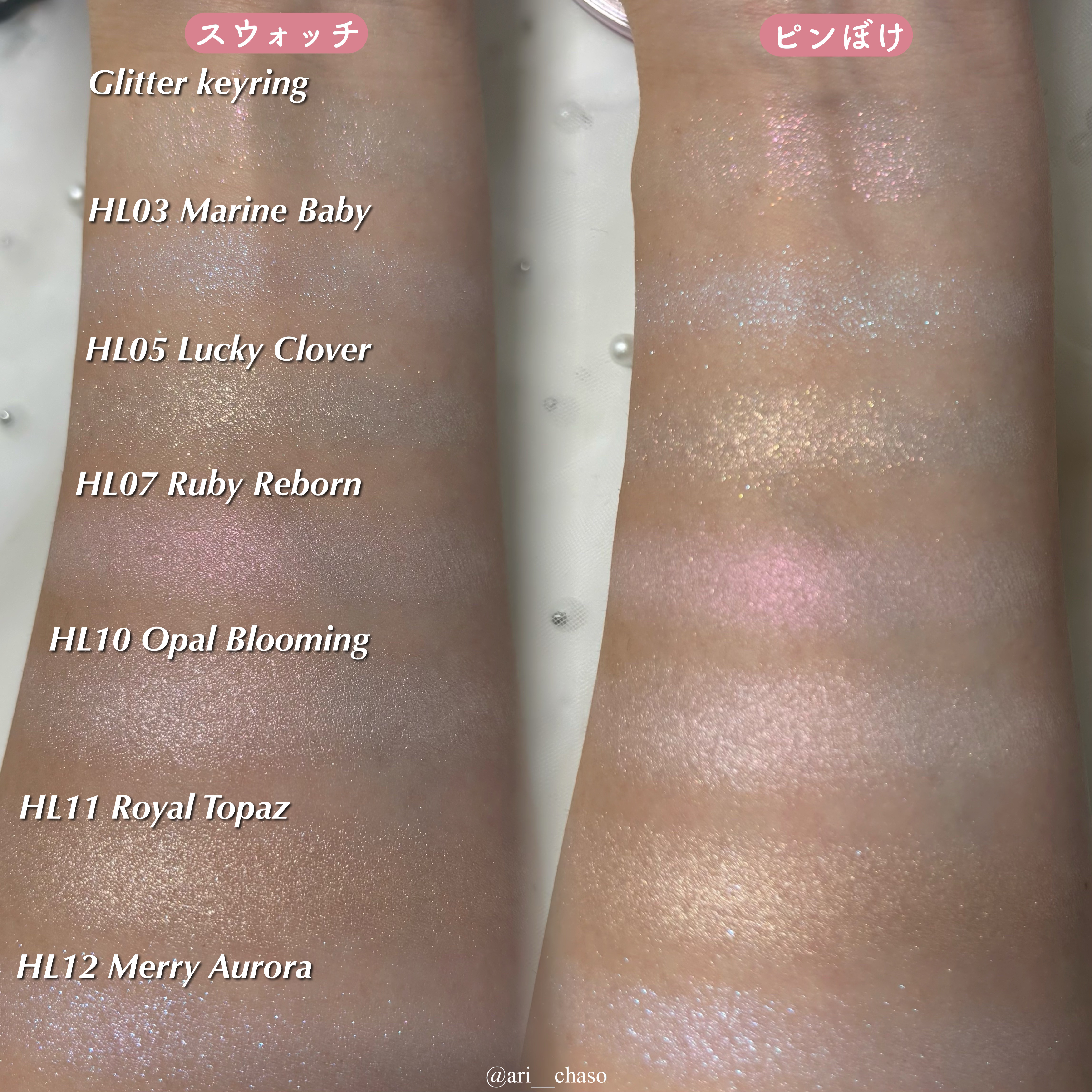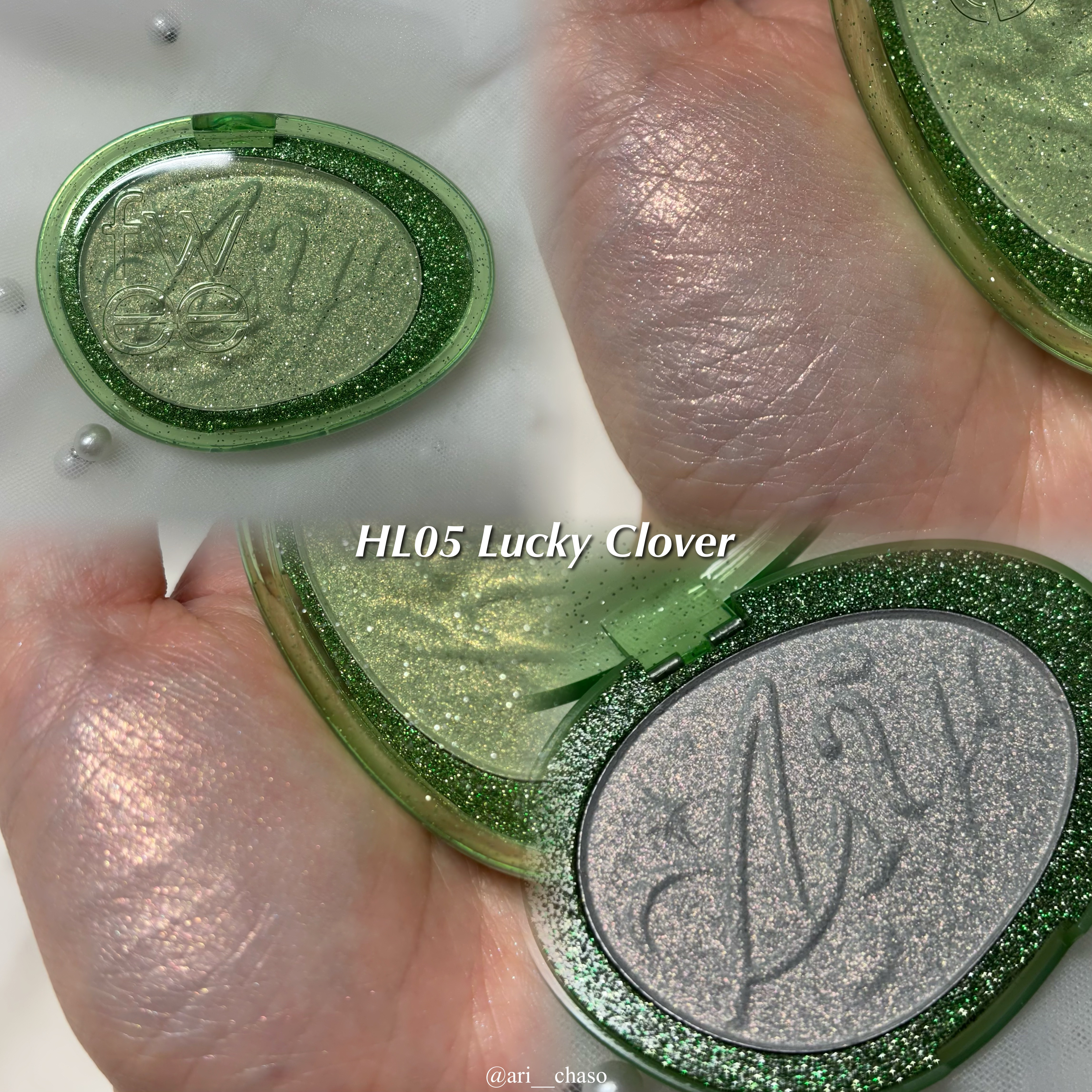 fweeグリッツストーンハイライター03マリンベイビー・神秘的な水色の煌めきが鮮やかに輝くブルービーム#ブルベオススメ05ラッキークローバー・華やかなレモンベースに密かに隠されたクローバーグリッターが魅力的なグリニッシュグリッタービーム#イエ...