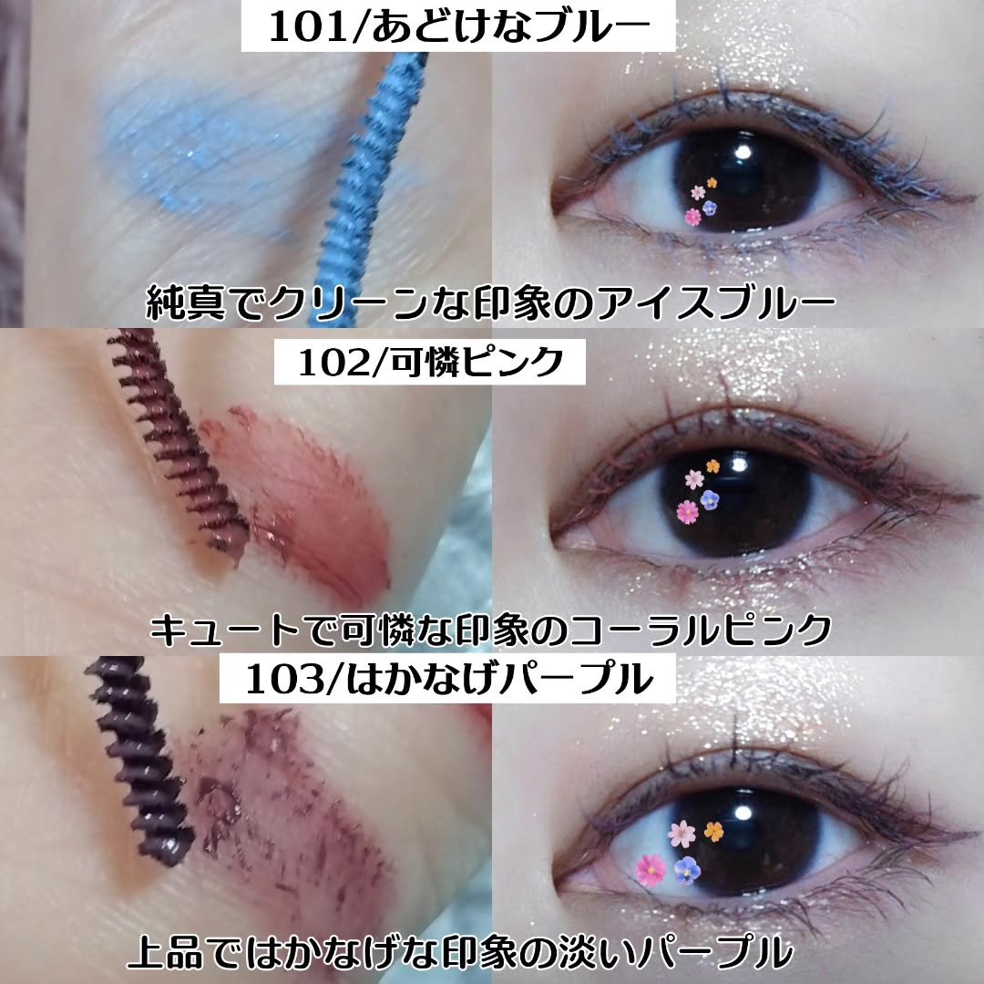 カスミ草ブーケのような限定色 101あどけなブルー / 102可憐ピンク / 103はかなげブルー が2/16に数量限定発売✌🏻 極細マスカラで塗りやすく、まつ毛一本一本綺麗にキャッチしてセパレートしてくれる🫡 カールキープ力もあって、涙ストロング成分で滲みにも強い。この3色の中では103はかなげパープルが普段使いしやすいよ☺️👏🏻
