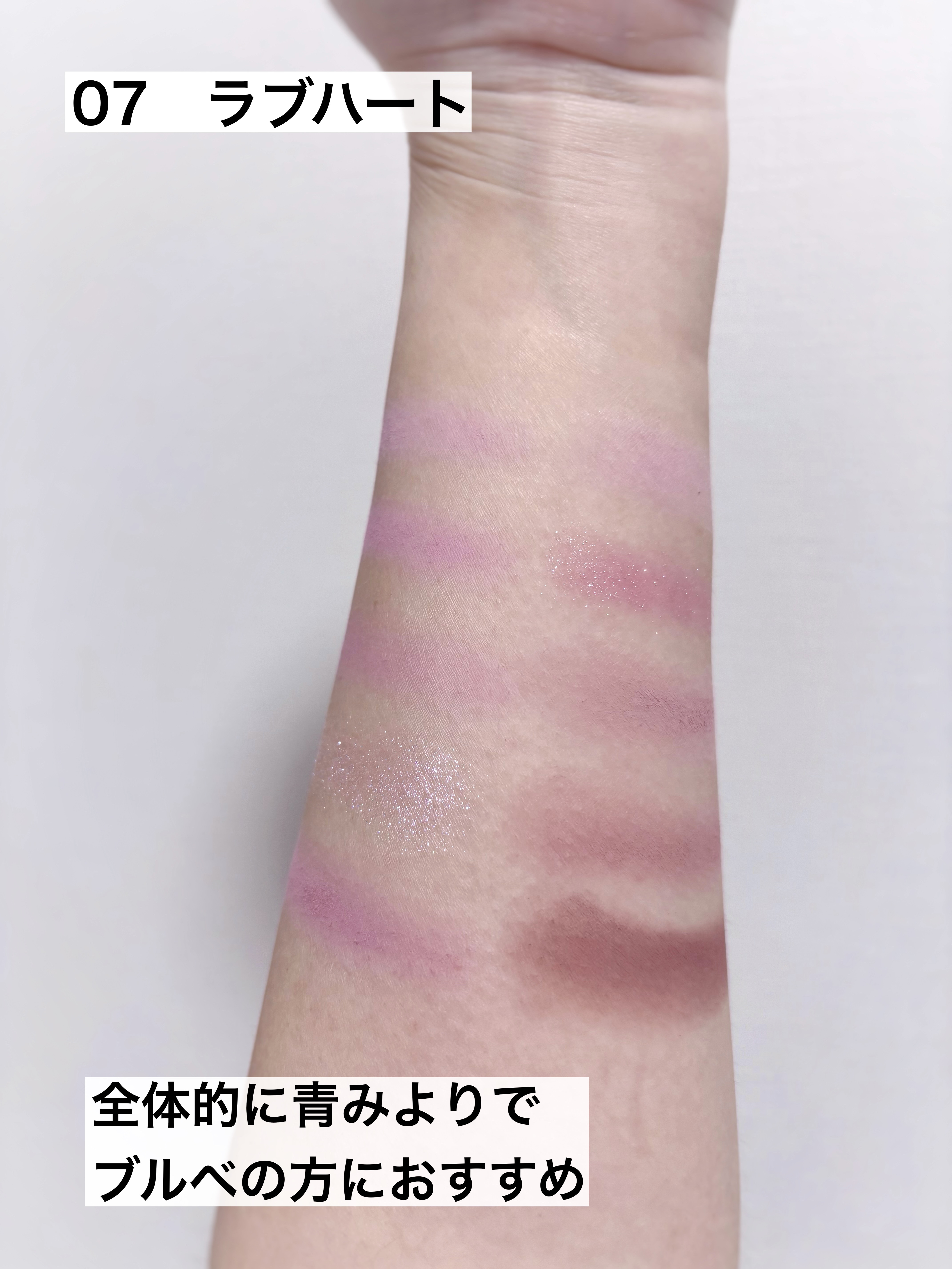 粉質も粉飛びしなくて良くて 発色も見たまま発色するのでよかったです。 色味は全体的に明るめのくすみのない 青みよりのピンクでまとめられていて ブルベ向きです。 締め色もあり、マットもラメも ブルベ冬向きの色もあるので ブルベの方は全体的に使えそうです。