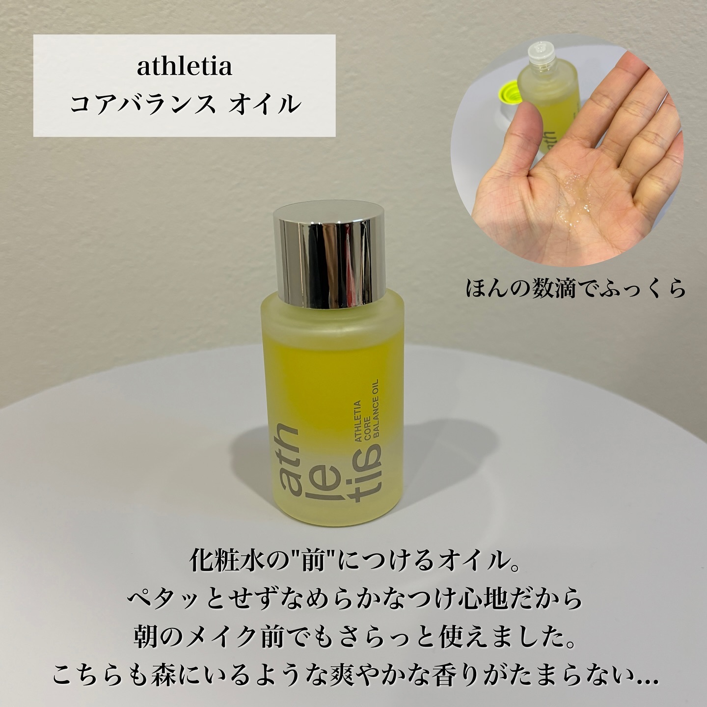 ◯athletiaコアバランスオイル導入美容液として。1回で3滴ほど。香りはあります!オーガニック系の柑橘のようなグリーンのような私はこの香りに癒されて深呼吸してます♡沖縄の夏にオイルって相性悪そうと思ってました⚡️けど会社で1日中エアコンが...
