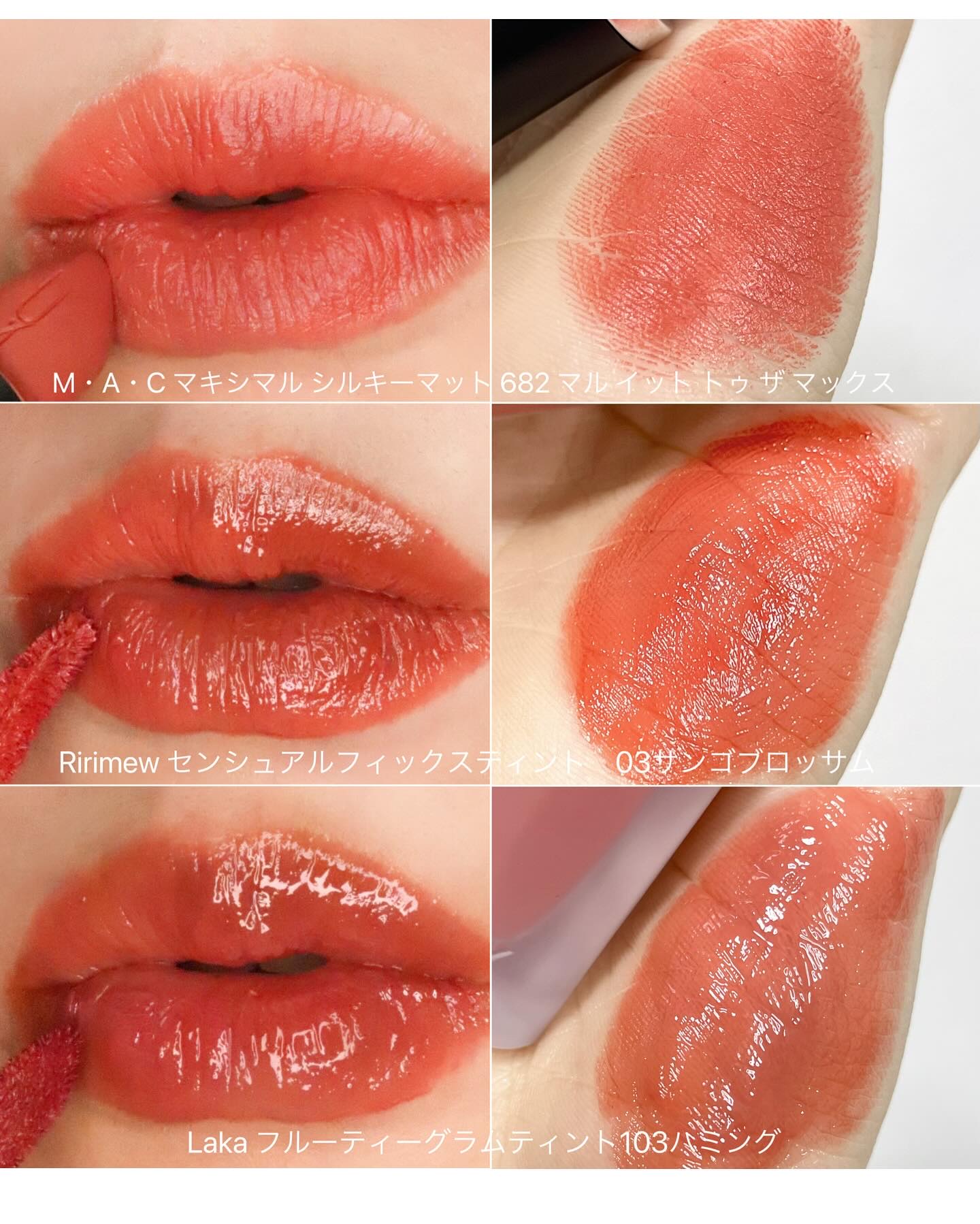 MACパウダーキスインパルシブ 黄色味を強く感じるブラウン〜ベージュの間くらい。キャメル色といった感じでしょうか。パウダーがふわっと柔らかく見せてくれてオシャレ。 KATE リップモンスター 透け感のある赤みブラウンで暗すぎず柔らかいブラウン。使いやすい。 ANNA SUI ティント ルージュ ギラッと光るメタリックコッパーが珍しいティント。ベースの色はなくパールで色味が出るのでムラになりやすいです。