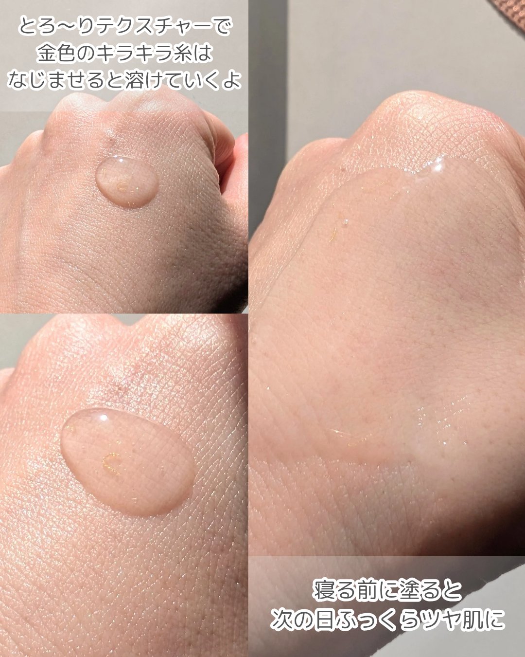 - <35mL> 水、BG、グリセリン、メチルプロパンジオール、1,2-ヘキサンジオール、ナイアシンアミド、カルボマー、トロメタン、PPG-13デシルテトラデセス-24、ヒドロキシエチルセルロース、シルクエキス、アデノシン、トチャカ、カンテン、エチルヘキシルグリセリン、EDTA-2Na、(アクリルレート/アクリル酸アルキル(C10-30))クロスポリマー、合成フルオトフロゴバイト、ベタイン、パンテノール、加水分解エラスチン、酸化チタン、赤色酸化鉄、マイカ、ジェランガム、加水分解コラーゲンエキス、ツボクサエキス、プロパンジオール、リン酸アスコルビルMg、ドクダミエキス、レシチン、アセチルグルタミン、フェノキシエタノール、カワラヨモギエキス、ヒアルロン酸Na、カプリリルグリコール、酸化スズ、金、スクワラン、水添ポリイソブテン、ベンジルグリコール、合成ヒト遺伝子組換オリゴペプチド-1、合成ヒト遺伝子組換ポリペプチド-1、合成ヒト遺伝子組換オリゴペプチド-2、合成ヒト遺伝子組換ポリペプチド-11、合成ヒト遺伝子組換オリゴペプチド-9、加水分解ムコ多糖、コラーゲン、トコフェロール、ヒアルロン酸クロスポリマーNa、加水分解ヒアルロン酸、合成ヒト遺伝子組換デカペプチド-7、合成ヒトオクタペプチド-4、合成ヒトペンタペプチド-19、ヒアルロン酸ヒドロキシプロピルトリモニウム、バルミトイルペンタペプチド-4、アセチルヘキサペプチド-8、トリペプチド-1、銅、ヒアルロン酸、ハナスゲ根エキス、アセチルヒアルロン酸Na、ラズベリーケトン
