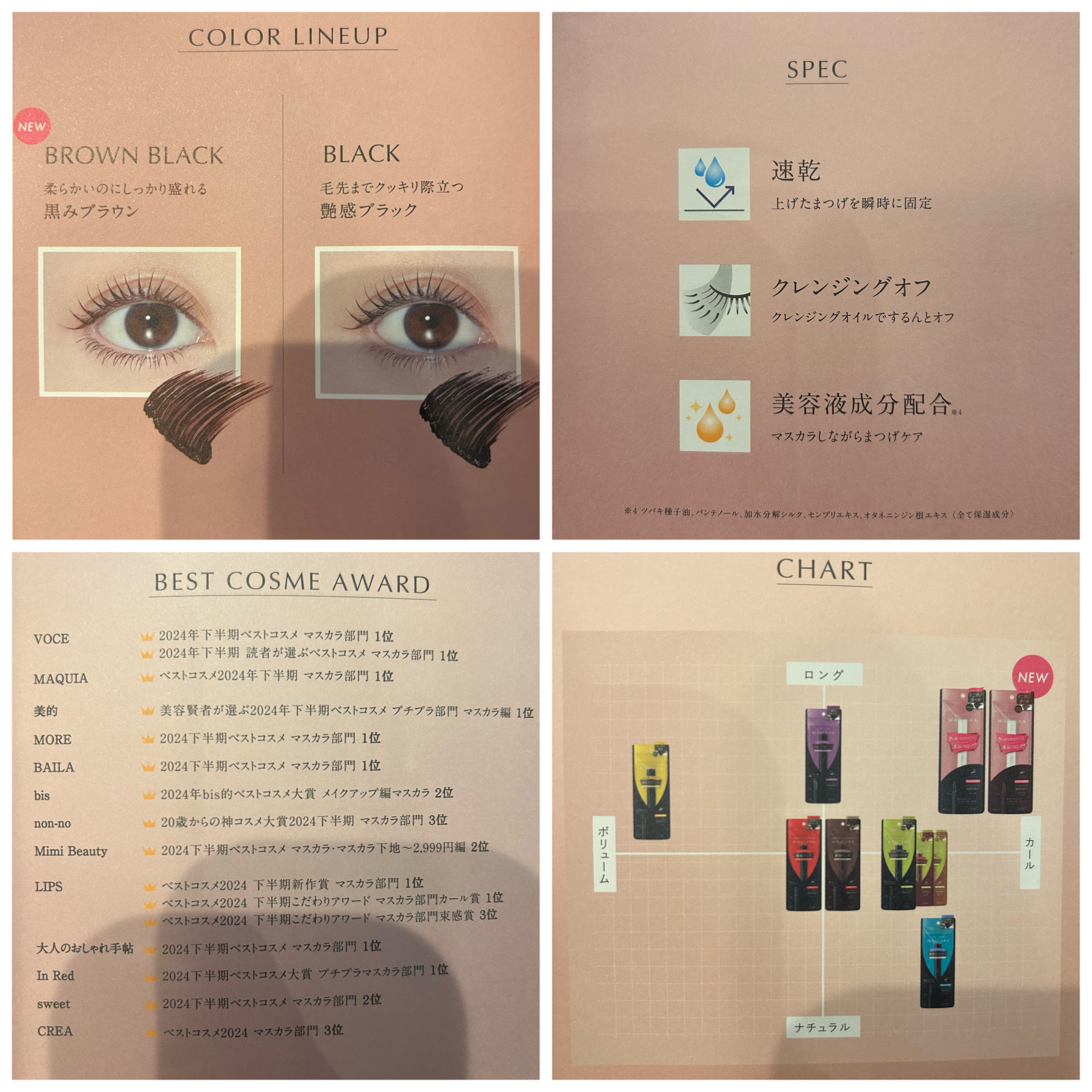 - LIPSベストコスメ2024 下半期新作賞 マスカラ部門1位LIPSベストコスメ2024 下半期こだわりアワード マスカラ部門カール賞1位LIPSベストコスメ2024 下半期こだわりアワード マスカラ部門束感賞3位LIPS月間トレンド賞2024年11月 コスメ部門3位