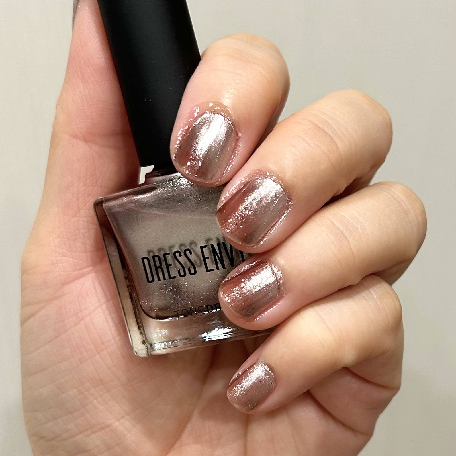 TONE DROP ネイルポリッシュシリーズ第3弾サテンマグネットポリッシュ!!コンセプトが嬉しすぎて購入しました✨️ ポリッシュをたっぷりめに塗って、マグネットスティックを近づけると…ラメが動く!!私はものすごく不器用なので、マグネットスティックを近づける際に間違えて爪に触っちゃってポリッシュが剥げたりとかしましたが(笑)楽しく出来ました! 今回塗ったのは45 Dress Envyです。実際はもう少しピンクみがありますが、結構大人っぽい色でした!