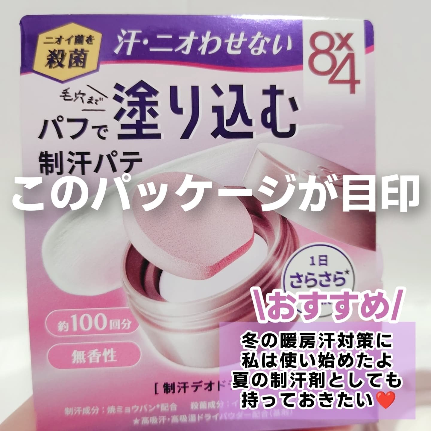 - 【医薬部外品】 パフで塗り込む制汗パテ 一日ずっと汗・ニオイを防ぐ ●パフで毛穴まで塗り込む制汗パテ ●クッションパフ+柔らかパテで毛穴まで入り込んでピタッと密着 ●するっ!としたら塗り込めたサイン! ●汗のニオイの元となるニオイ菌を殺菌して1日ずっと汗・ニオわせない。 ●汗が気になる時でも1日ずっとさらさら*1持続 ・制汗成分:焼ミョウバン*2配合 ・殺菌成分:イソプロピルメチルフェノール配合 ・高吸汗・高吸湿ドライパウダー配合(基剤) ○無香性 ○両脇塗布で約100回分(使用量の目安:片わき直径1.4cm) ○パフ1枚入り *1 高吸汗・高吸湿ドライパウダー(基剤)配合 *2 乾燥硫酸アルミニウムカリウム 効能効果:わきが(腋臭)、皮ふ汗臭、制汗