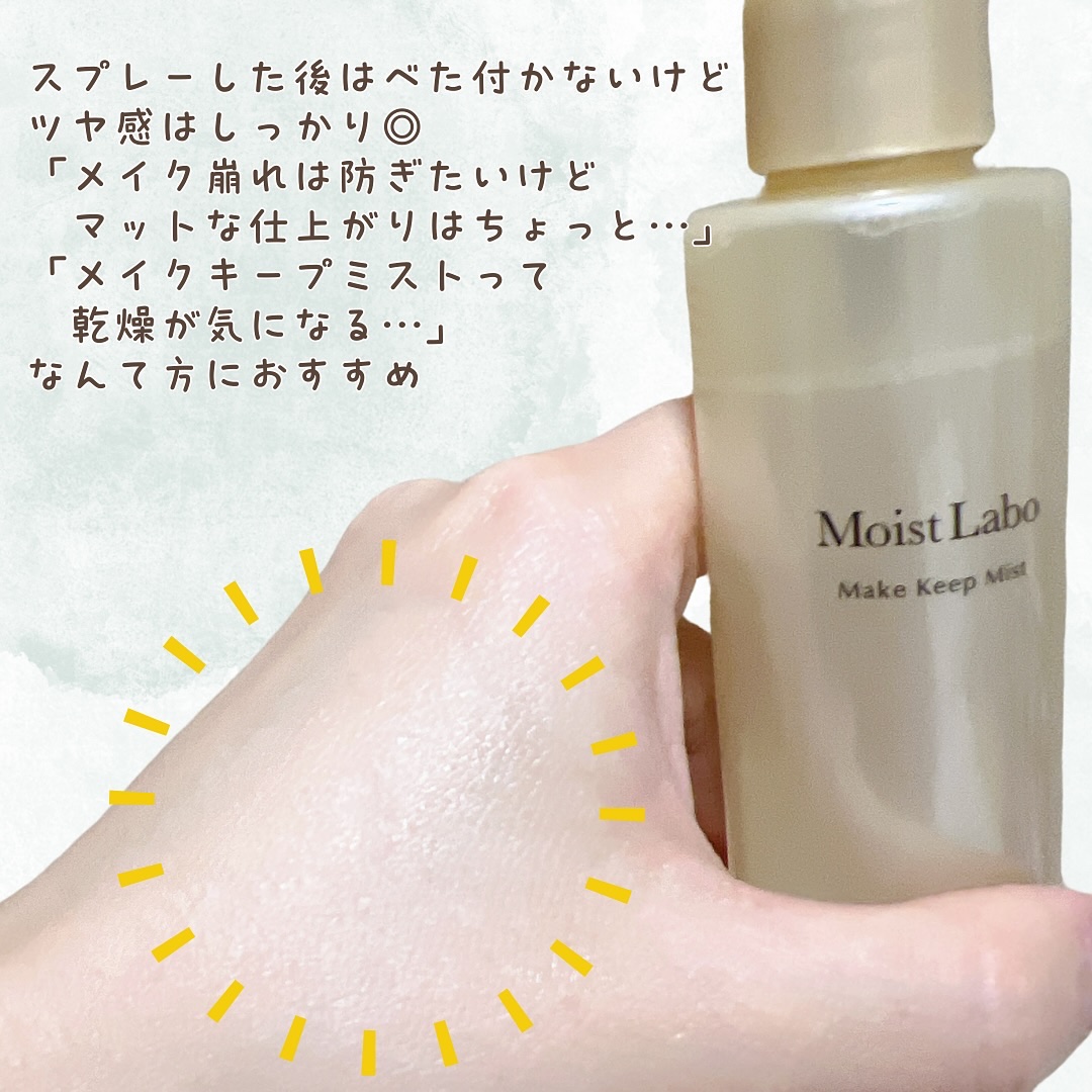 - 長時間うるツヤ肌続くメイクキープミスト 「モイストラボ メイクキープミスト< ツヤタイプ> 」はつけた瞬間、たっぷりのうるおいで満たし、日中の乾燥を防ぎながらメイク崩れをしっかり防いでくれるメイクキープミストです。美容液成分をたっぷり配合しているのでスキンケア効果が高く、ハリのあるツヤ肌に仕上げてくれます。
