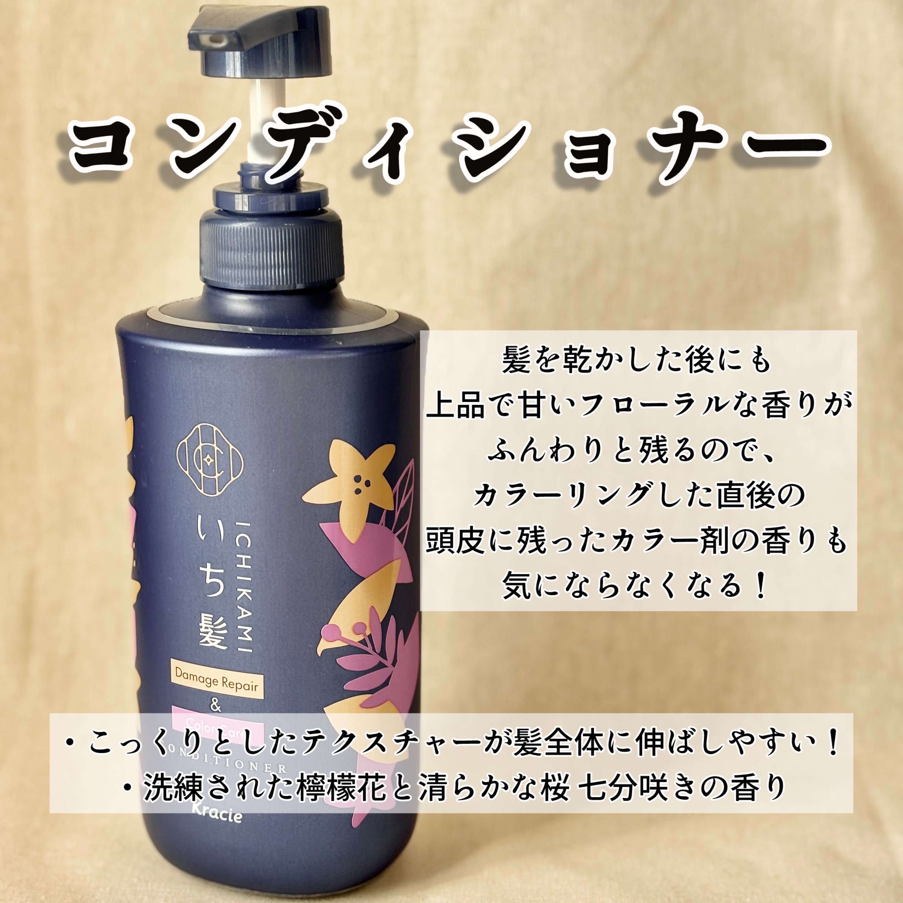 泡立ちがよくて、すっきり洗える印象でした!サルフェートフリーのノンシリコン処方で頭皮や髪のことを考えて作られているなと感じました。 リピジュア&べール成分配合ヘアカラーなどのダメージ、キシキシ髪のためにダメージ集中補修&予防。 いち髪らしい優雅な桜の香り🌸に、洗練された檸檬花の香りをブレンドされたそう!