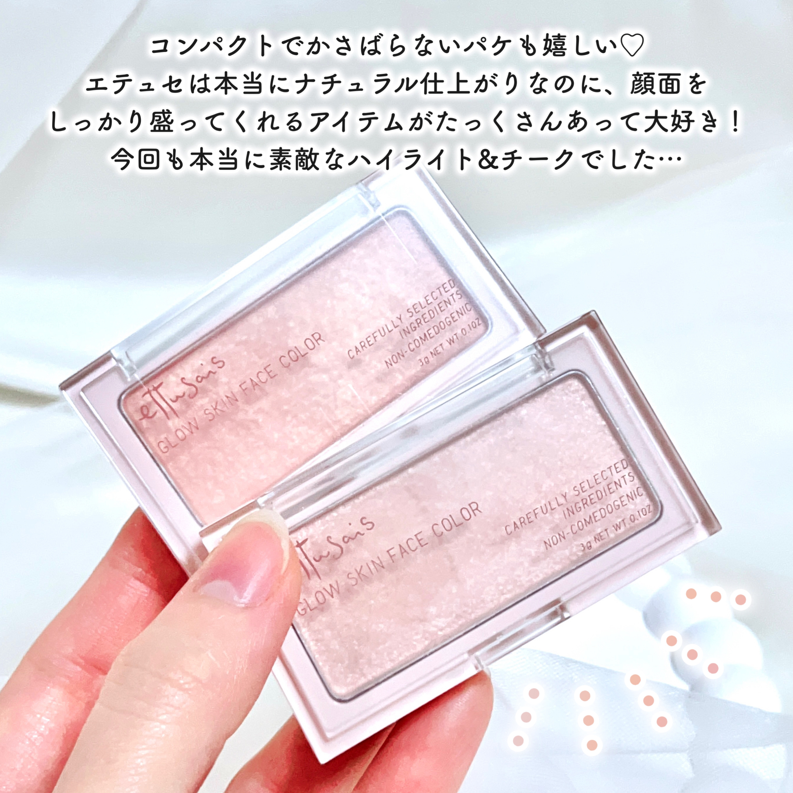 エテュセのフェイスカラー、待ってましたー!! もうね、ほんとうに使用感がよかった✨ うるおいが長時間続くスキンケア仕立てでテクスチャーだけでなく肌もしっとりが続く🫧 01 なじみつやハイライト 繊細な輝きでうるおったツヤ肌を演出 白浮しないピンクベージュ♡