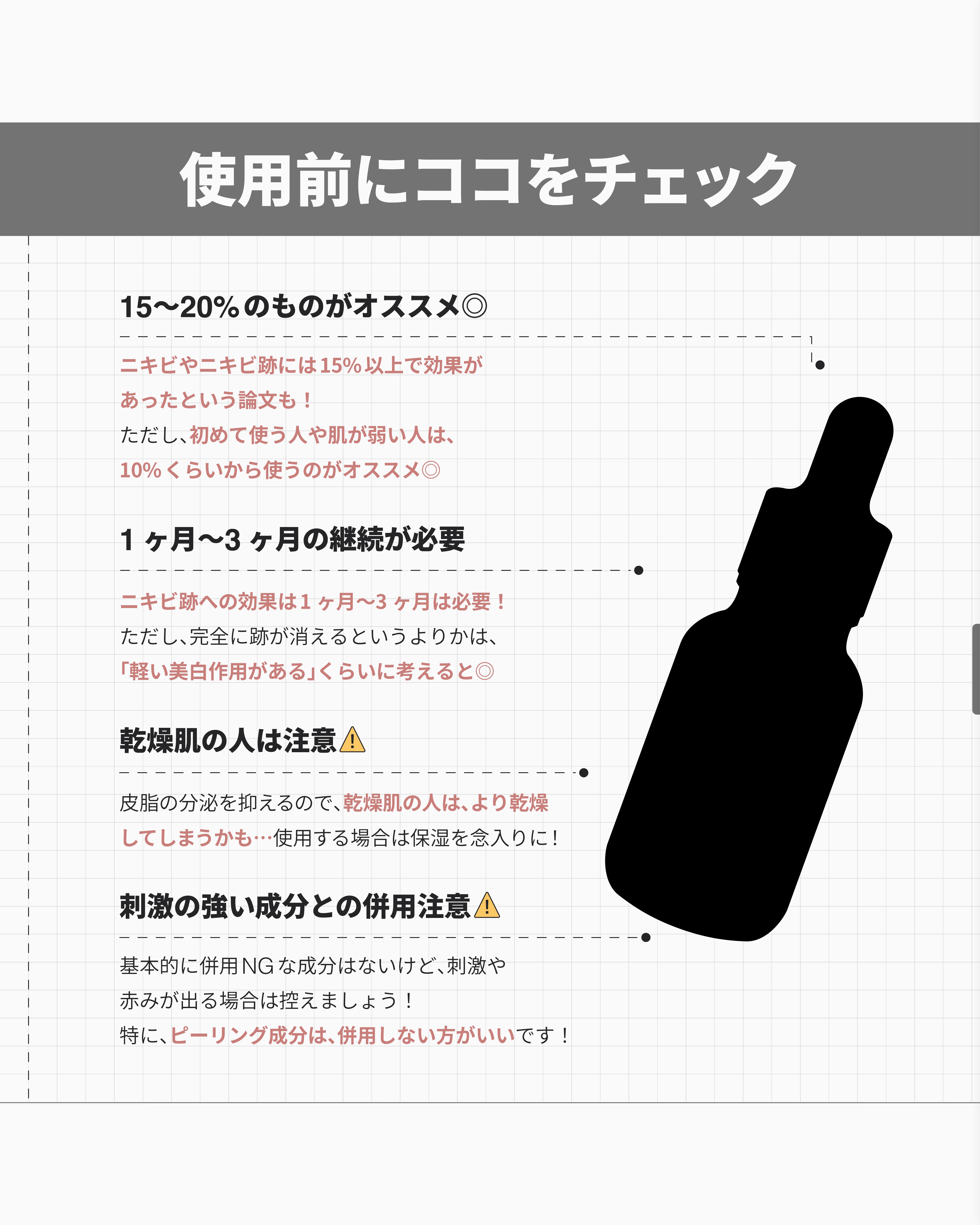 アゼライン酸は、世界中で「ニキビ治療薬」として使われ、約40年の実績を持つ成分!✨️ 日本では医薬品ではなく、化粧品成分として扱われてる! 肌への刺激が少なく、妊娠中でも使用できちゃうんです!💖 アゼライン酸の主な効果は…💫 副作用も少ない成分なので、肌質問わず使えるのも嬉しい! 特に、脂性肌や繰り返しニキビに悩まれてる方にオススメの成分!🌟