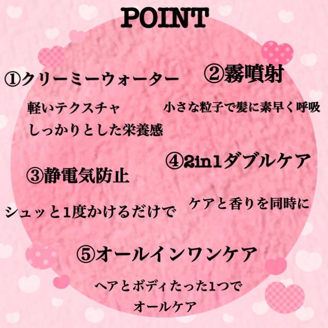 オイルタイプとウォータータイプのメリットだけを詰め込んだクリームタイプのミストです! このミストとにかく良い香り☺️ 単純にフローラルというのではなくその中にムスク系の甘さもある感じでどタイプな香りが気に入ってます✨ 髪の深部まで水分と栄養を補給してくれて髪にまとまりも出てツヤまで与えてくれて静電気も起きづらくなるしそれでいて香りも良くてといい事尽くしすぎて感動です😳