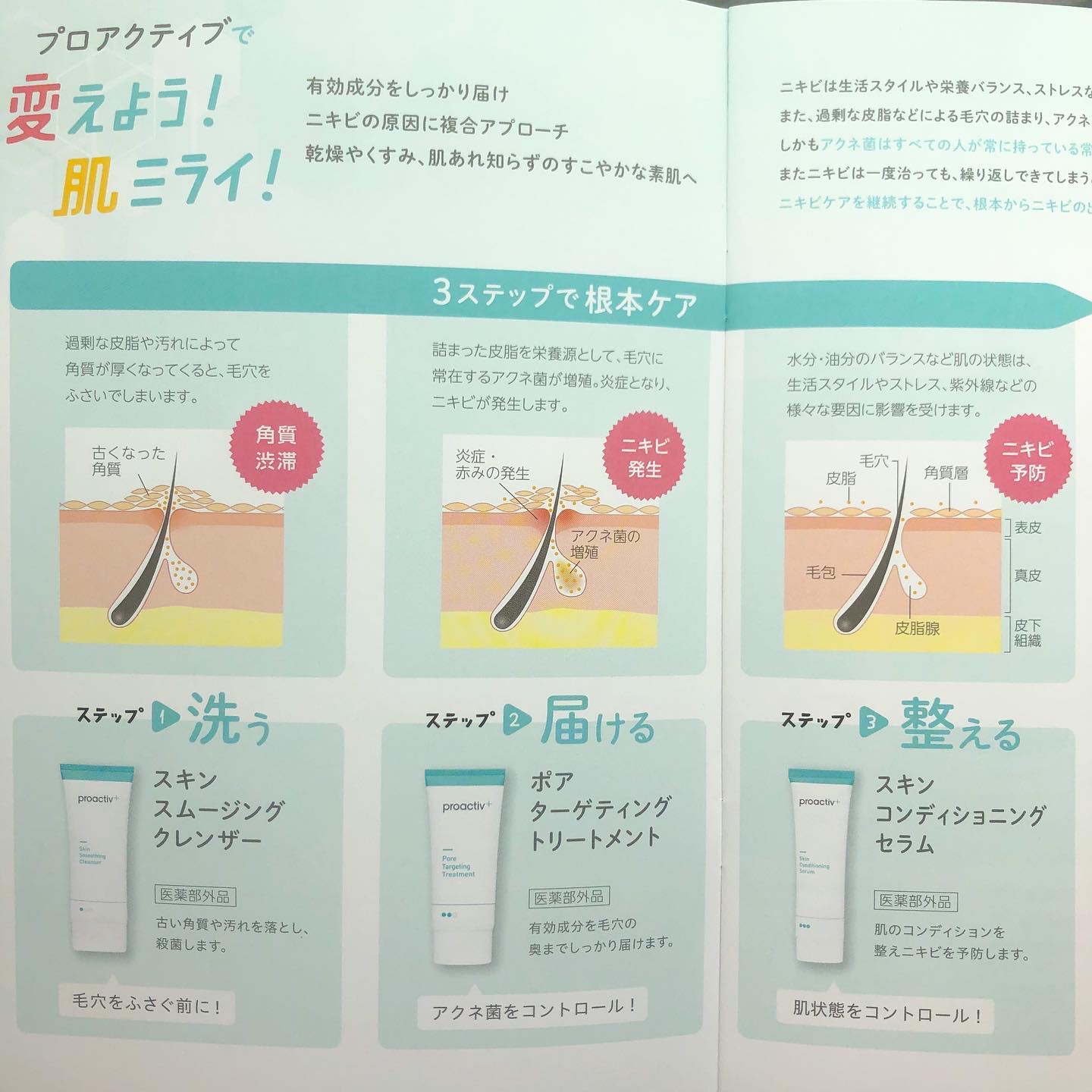 - プロアクティブ プラス製品 ●STEP1<薬用洗顔料>スキン スムージング クレンザー(医薬部外品) ニキビを予防し、毛穴の汚れまですっきり洗い流す薬用洗顔料。 有効成分サリチル酸を配合。ニキビのできにくい健康的な肌へ導きます。 ●STEP2<薬用美容液>ポアターゲティング トリートメント(医薬部外品) 有効成分とうるおいを毛穴の奥まで届ける薬用美容液。 新技術「スマートターゲット™ テクノロジー」を採用。 有効成分を毛穴の奥までダイレクトに届けます。 ●STEP3<薬用ジェル状クリーム>スキンコンディショニング セラム(医薬部外品) 肌のコンディションを整え、ニキビを予防する薬用ジェル状クリーム。 保湿効果の高い選び抜かれた植物エキスを贅沢に配合。 肌あれやニキビを予防し、内側からふっくらと押し上げるようなハリ感をめぐらせ、肌のキメを整えます。