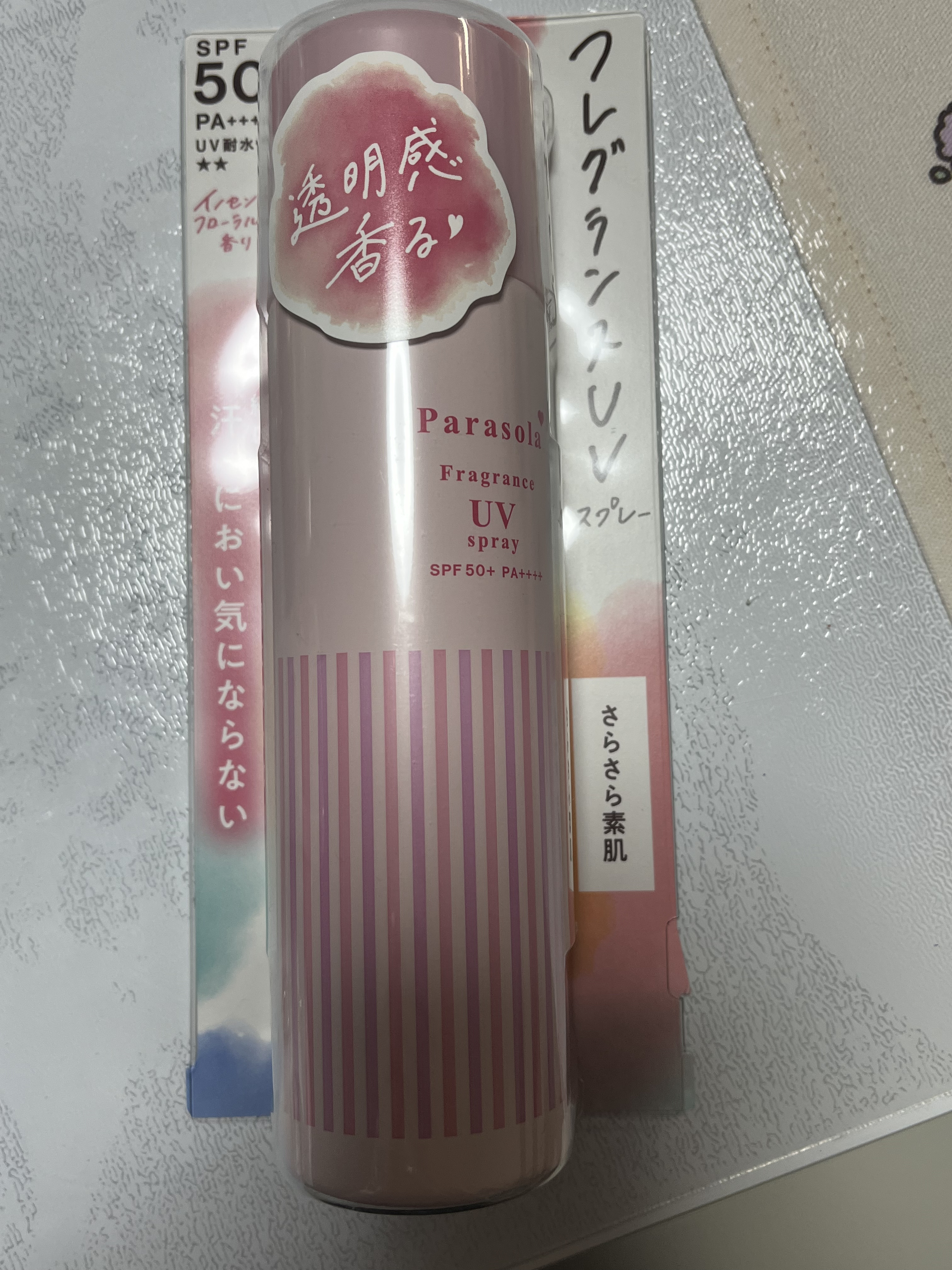 スプレータイプの日焼け止めローション(SPF50+) 汗、水、皮脂に強いウォータープルーフタイプ。 べたつきフリー処方でさらさら肌続く。 イノセントフローラルの香りです。少し香りは強い香りでした!