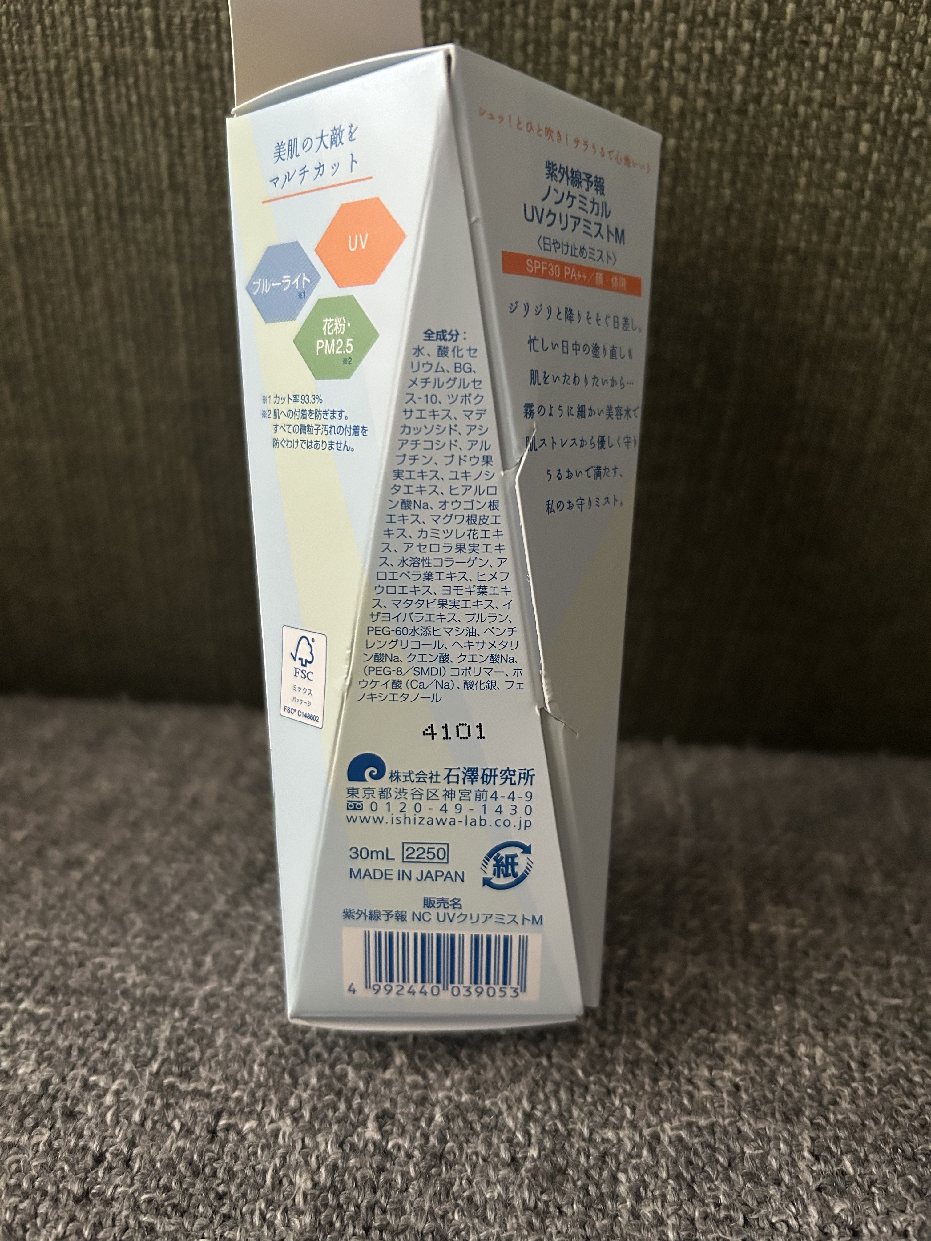 - 霧のように細かい美容水で乾燥による外的刺激から優しい使い心地で守り、うるおいで満たすお守りUVミスト。 美容の大敵になるUV、ブルーライト*1、花粉・PM2.5*2をマルチカット! 白浮きしないのに紫外線吸収剤不使用で、敏感肌にも使えます。 メイクの上からでもOK、逆さでも使えるから日中の塗り直しにもピッタリ♪ ・SPF30 PA++ ・顔、体用 ・石けんで落とせる ・無色素、無香料、無鉱物油、酸化亜鉛フリー、石油系界面活性剤不使用、紫外線吸収剤不使用(ノンケミカル)、ノンパラベン、ノンシリコン、ノンアルコール *1 カット率93.3% *2 肌への付着を防ぎます。すべての微粒子汚れの付着を防ぐわけではありません。