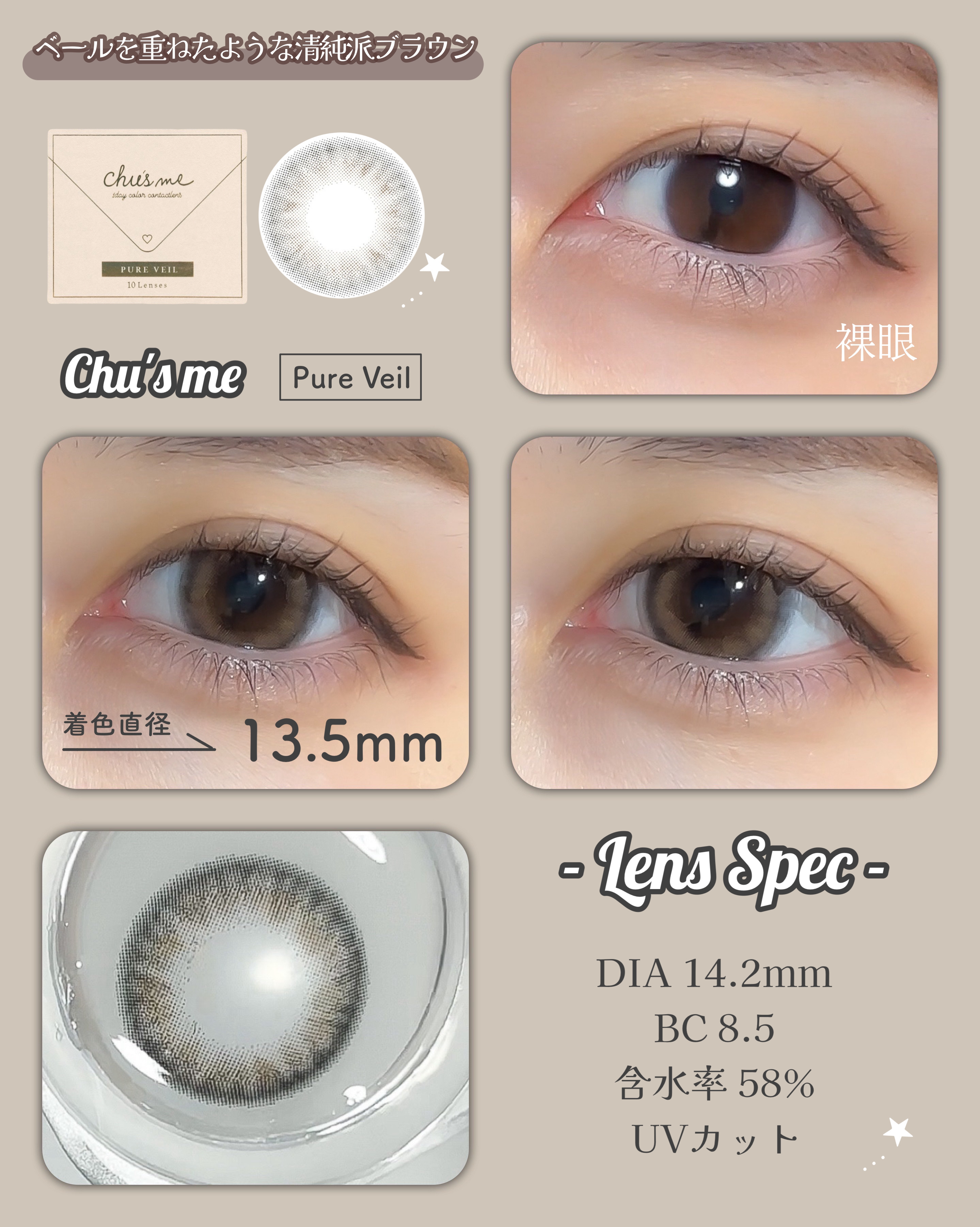 ゆうこすプロデュースコンタクトレンズブランド「Chu's me」の新色 縁は薄くて瞳の中がキラキラとした生まれつき瞳の色素が薄いような発色になる! 色素の薄いベージュカラーに黒ふちがありくりっと瞳に!奥目大優勝レンズ♡