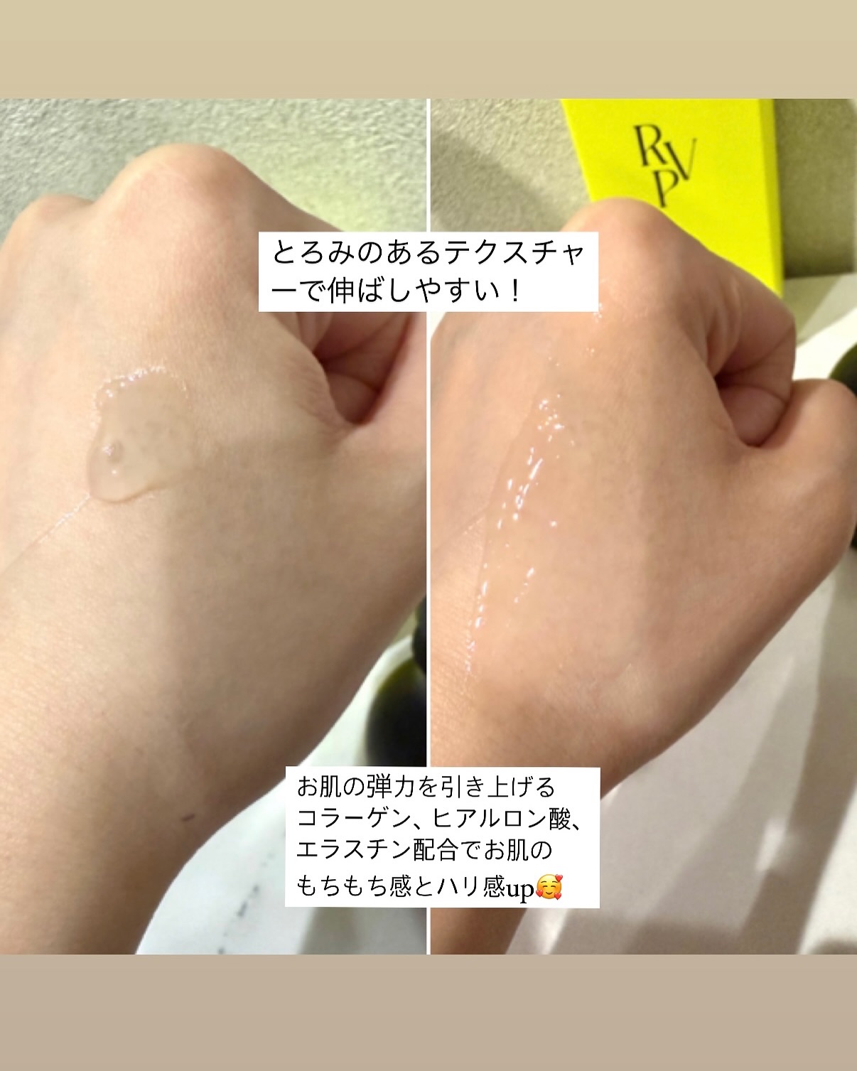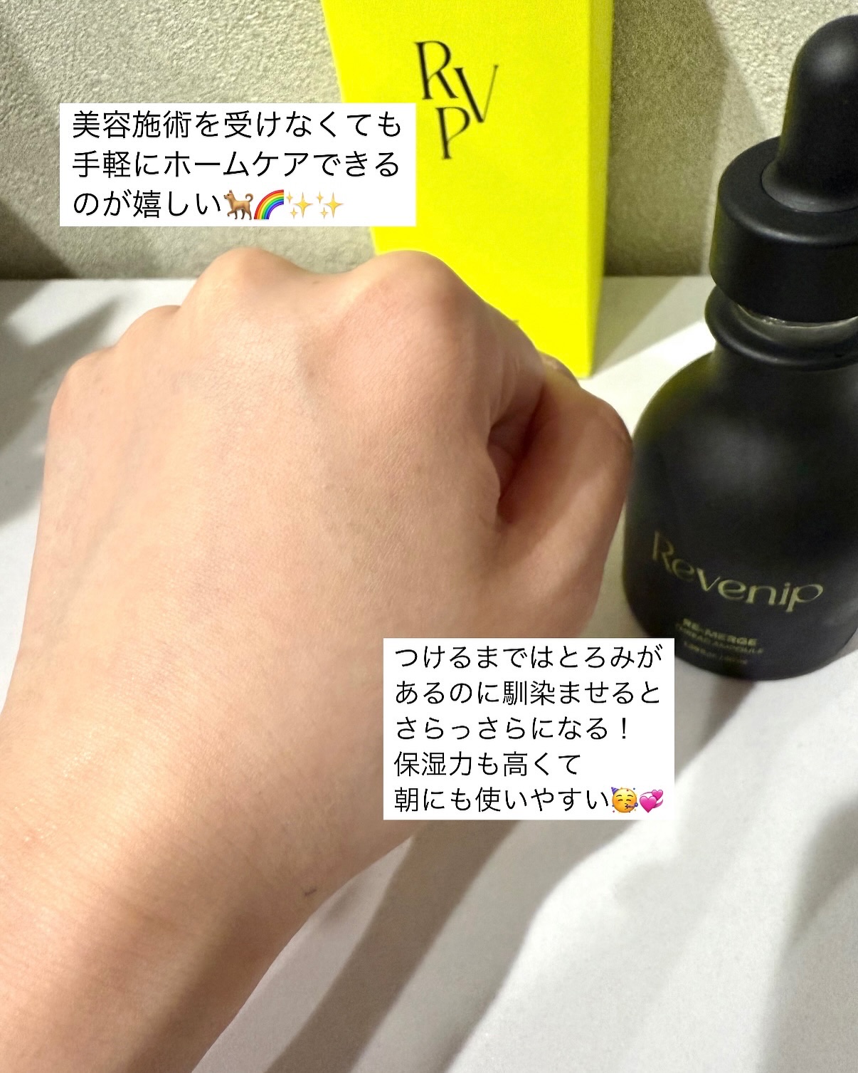 黒いデザインのボトルが素敵。Revenip (リベニプ)のリマージ糸リフティングアンプル、美容液です。 一見ジェルのようなのですが、ネバーっと糸を引くようなテクスチャにびっくり。 ネバーっとしてはいますが不思議とベタベタはしない使用感なんです。