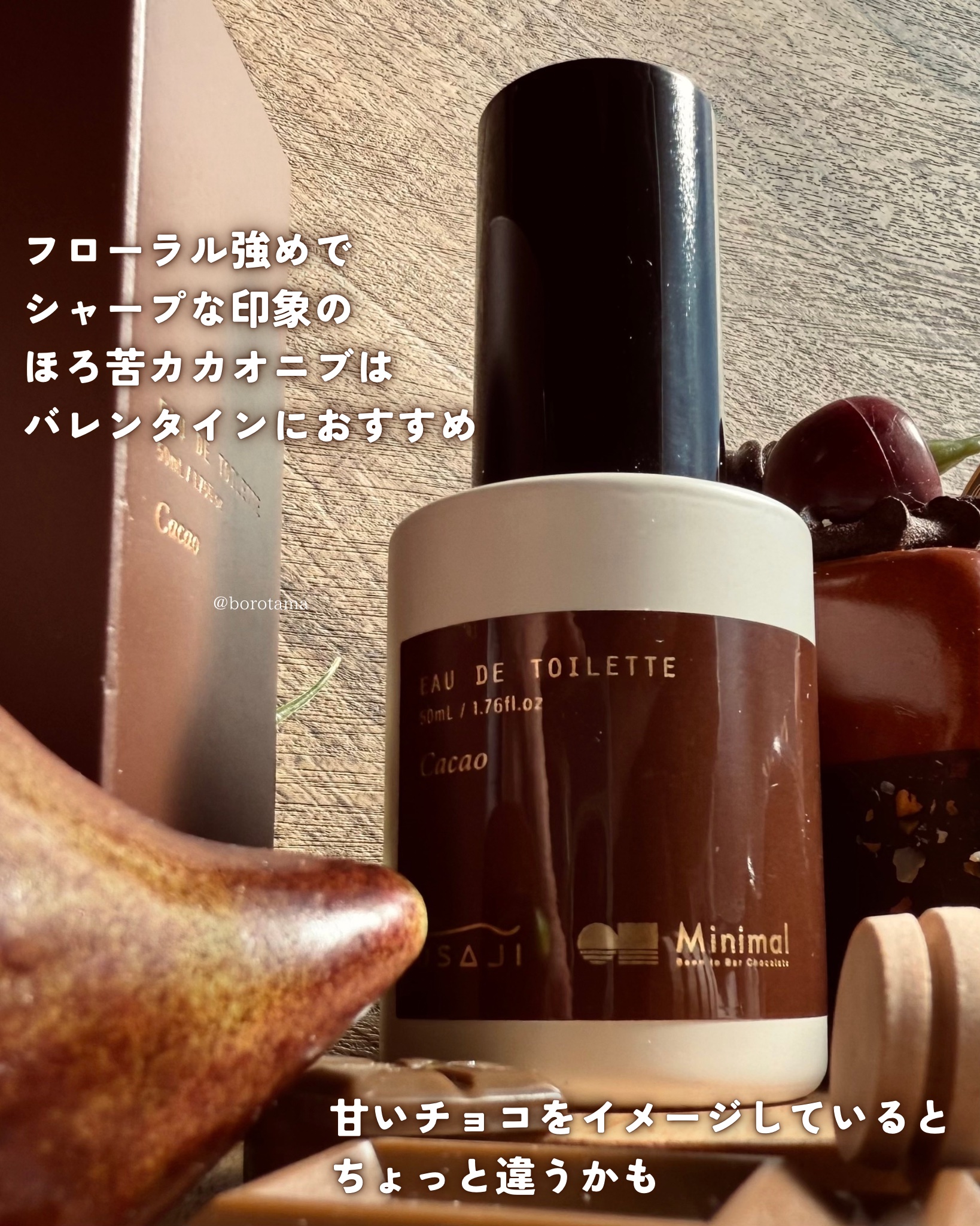 このトワレの凄いところはチョコっぽい!とかチョコレートをイメージした香り🥀ではなくって、最初から最後までずーっとチョコの香りなんです。 お店のテスター用の紙に吹きかけたものを家に持ち帰り棚の上に置いたら3日くらいずっと部屋がチョコの香りでいっぱいでした。 マフラーに吹きかけたら1週間はしっかり香ってて、10日経っても未だにほんのり自分にチョコの香りしてきますw