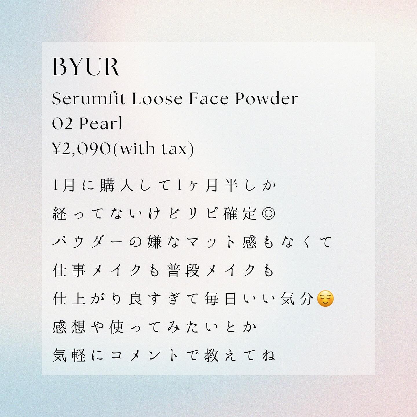 ★ByuRセラムフィットルースフェイスパウダー01クリア★なんでもっと早く買わなかったんだろう。悩んでた期間を後悔するほど良かった!バイユアは、シートマスクが好きでスキンケア系ではお世話になってるのですが、メイク用品盲点だったなぁ。手持ちのパ...