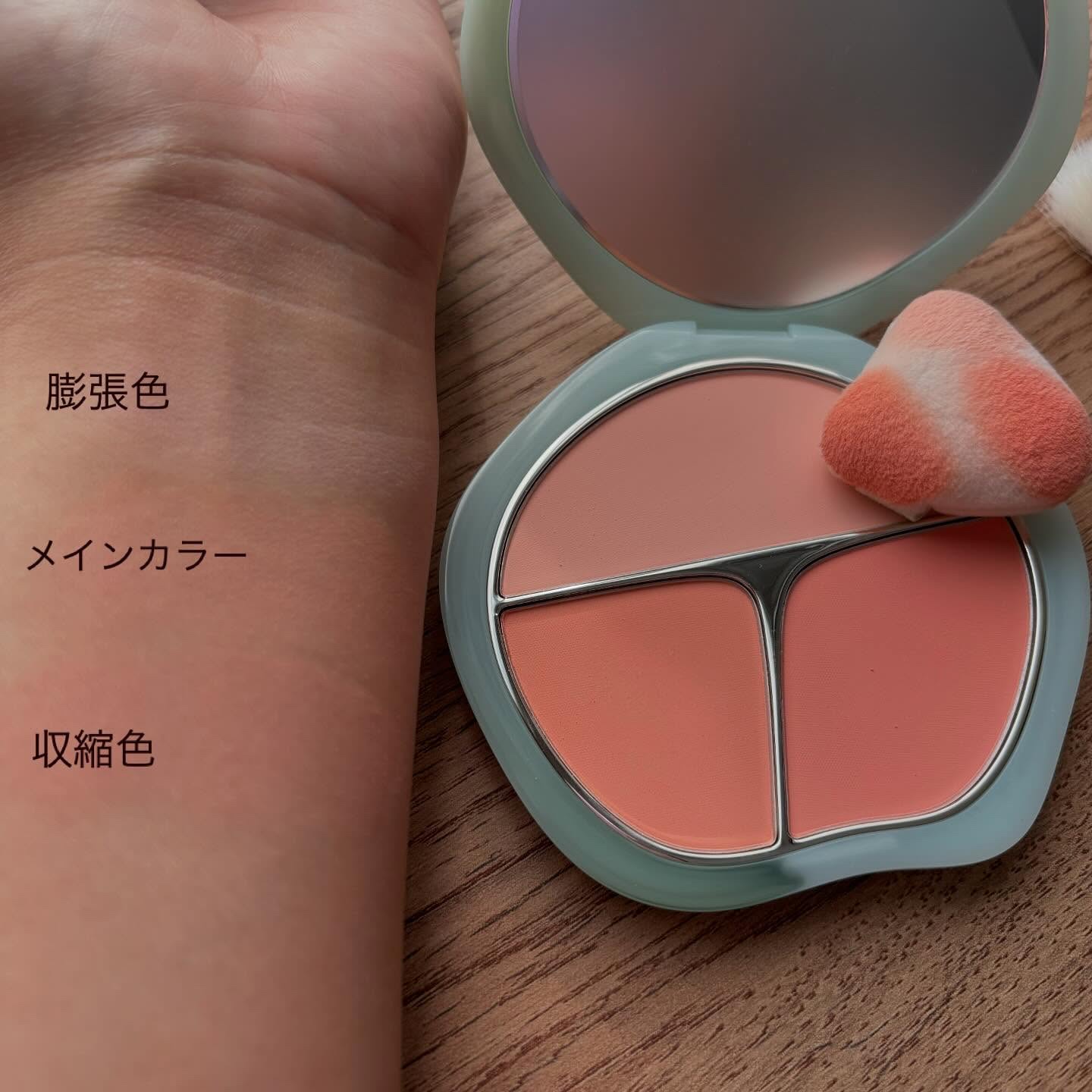 雰囲気と立体感を両立できるチークパレット 膨張色、メインカラー、収縮色の3つのカラーで調和の取れた立体感メイクへ♬ 発色は良いですが、お肌に自然な感じで馴染み 派手になりすぎず、とても使いやすいです♡ 3色の使い分けもわかりやすく 簡単に立体感が出せるのも嬉しいです🫧
