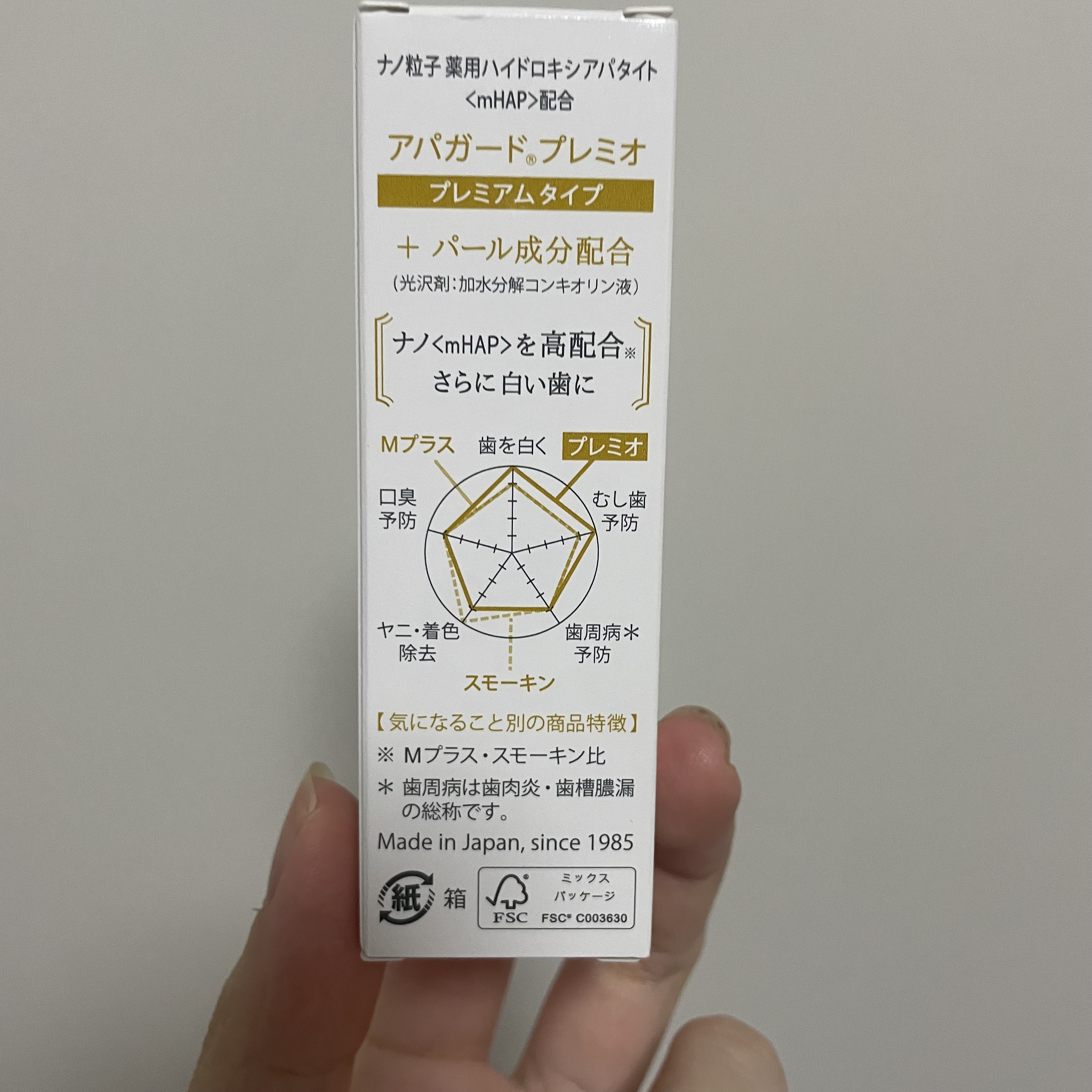 アパガードアパガードプレミオアパガードで店頭に並んでた4種類程の中で箱裏面に記載ある「歯の白さ」おすすめ度が1番高かったのがこちらだったので迷わず選びました☺️歯の白さ、ヤニ、ステイン、むし歯、歯周病、口臭とおすすめ項目とおすすめ度が裏面に書...