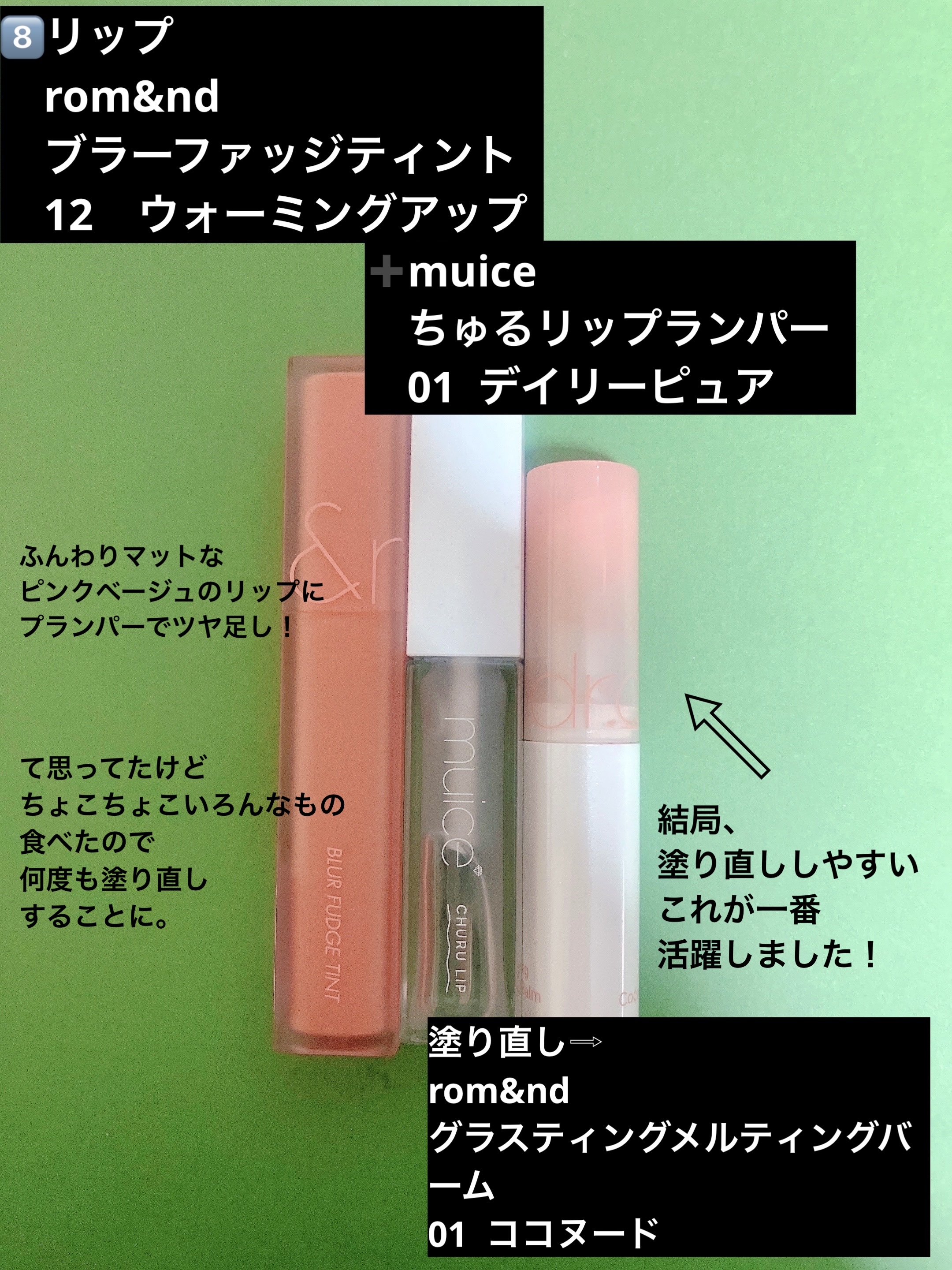 カワイイrom&nd合わせ🍇🥥を見つけてしまった🥹グラスティングメルティングバーム01を塗った上にジューシーラスティングティントの25を塗るととってもかわいい😆💕ザ・イエベカラーとザ・ブルベカラー、意外と合う✨✨🤍 🤍 🤍 🤍 🤍🥥rom&n...