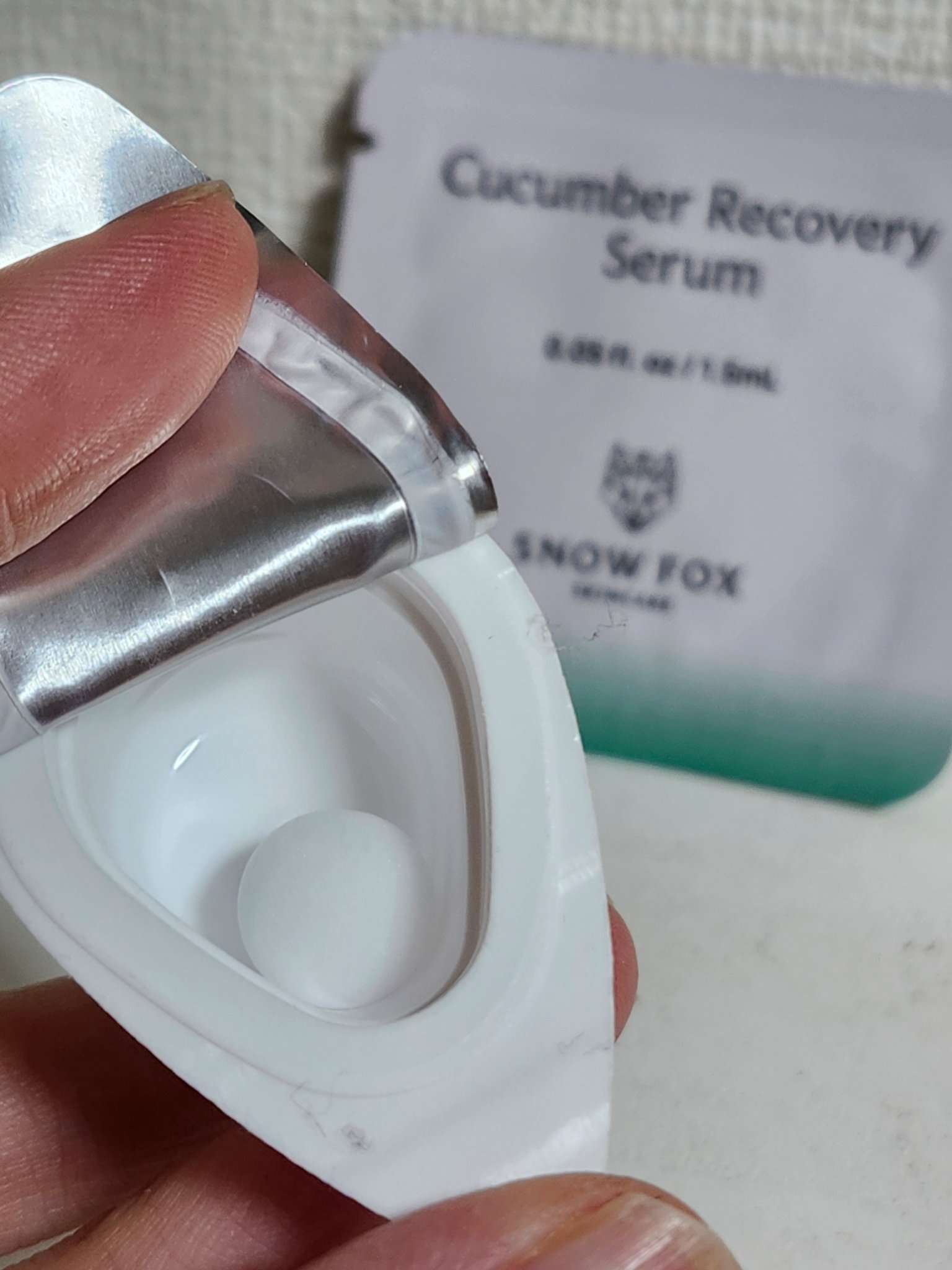 意外に使い方が簡単で別売りの美容液を混ぜ、ボールを溶かして肌に優しくなじませるように使います! 「リカバリーセラム(キューカンバー)miniサイズ」を合わせて一緒に使わせていただいたのでさらにシミやくすみにアプローチできて 保湿と肌のコンディショニングを整えるいい方向へ持っていけるのが最高! 一般的に出回っているフリーズボールと違って増粘剤や人工保存料が含まれていない100%無添加なのがすごいなと思いました! ボールはあっという間にセラムにとけて 贅沢なスキンケアができました!