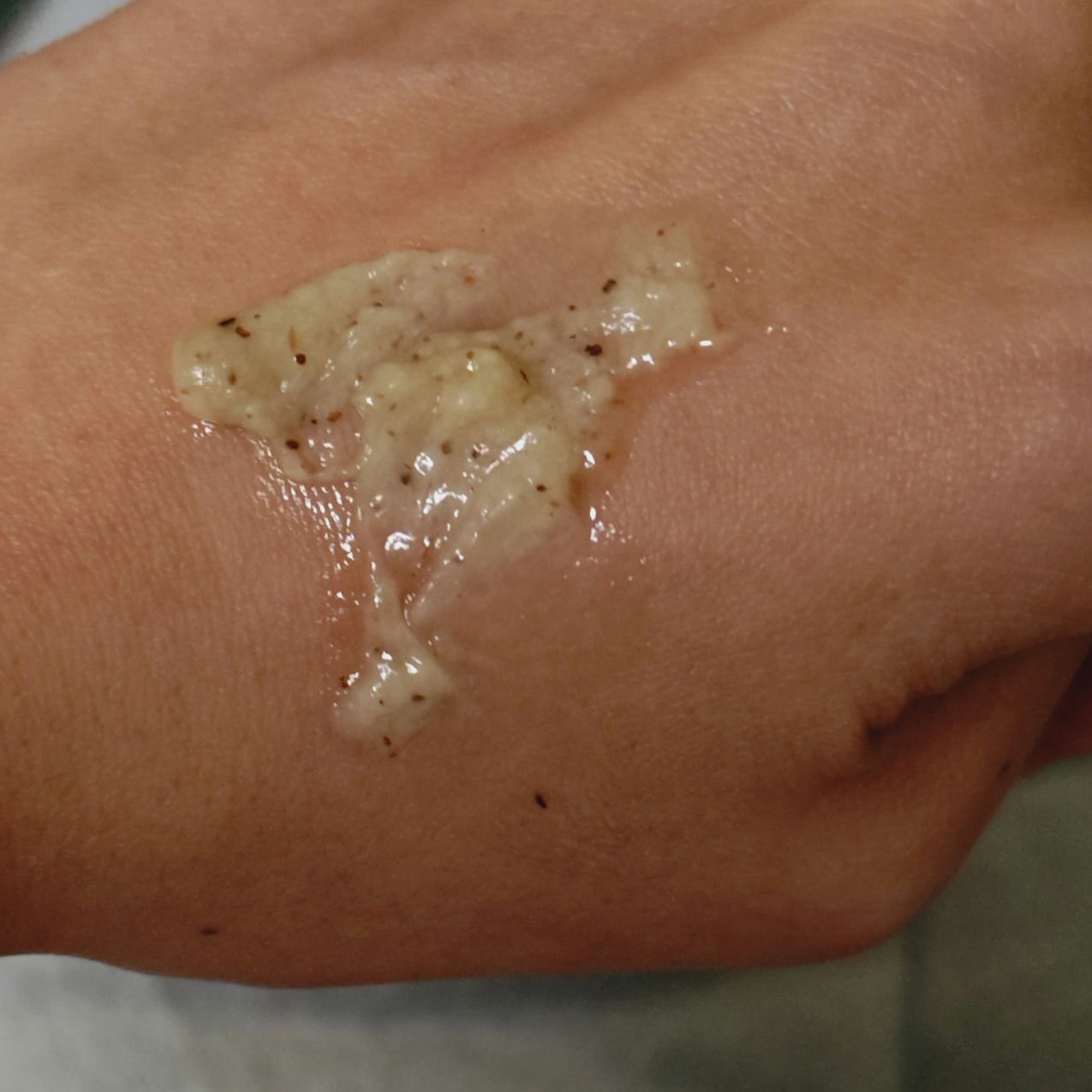中身は茶色っぽい色でスクラブみたいなつぶつぶが入ってる 泡立ちは普通できめ細かい泡にはならないがネットを使えば普通のふわふわの泡はできる! 洗い上がりはサッパリしすぎず少ししっとりした感じになる!