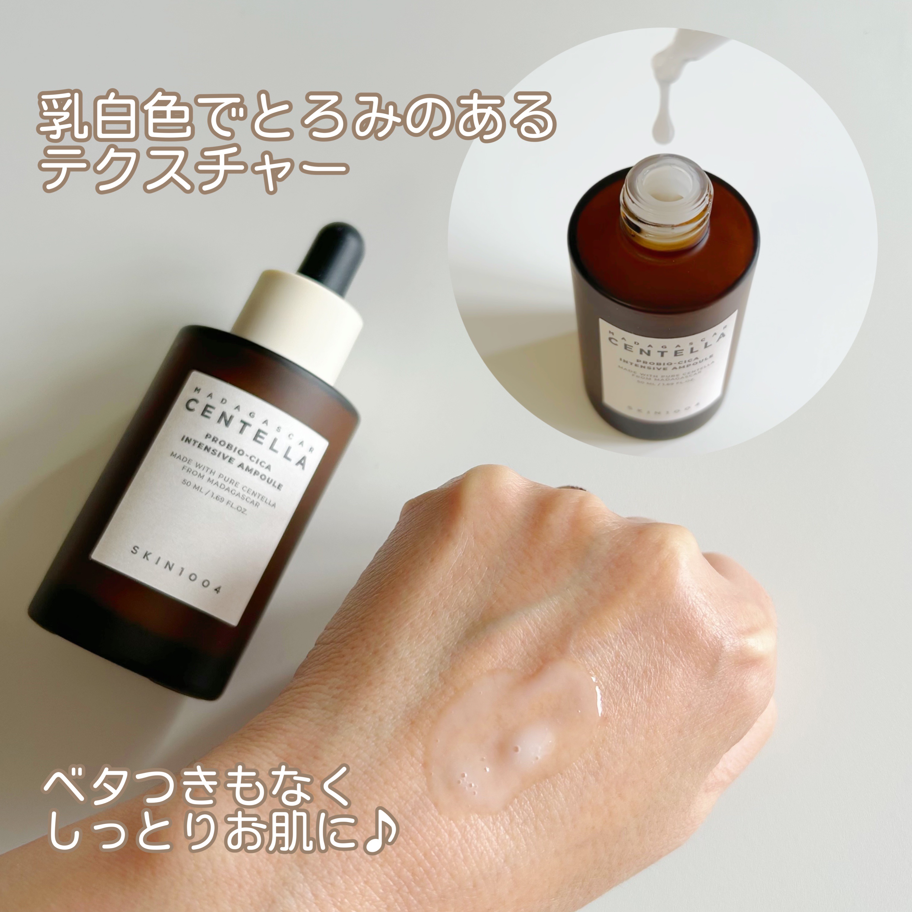 発酵センテラに高濃度TECAを加え外部刺激によって傷んだ肌を素早くケア ベタつきのない高濃度のアンプルでもっちり肌へ☺️✨ しっとりもっちりとした肌触り✨ ベタつかないので、アンプルが肌表面に留まるのではなく、肌の中からしっとりとするような印象です😊