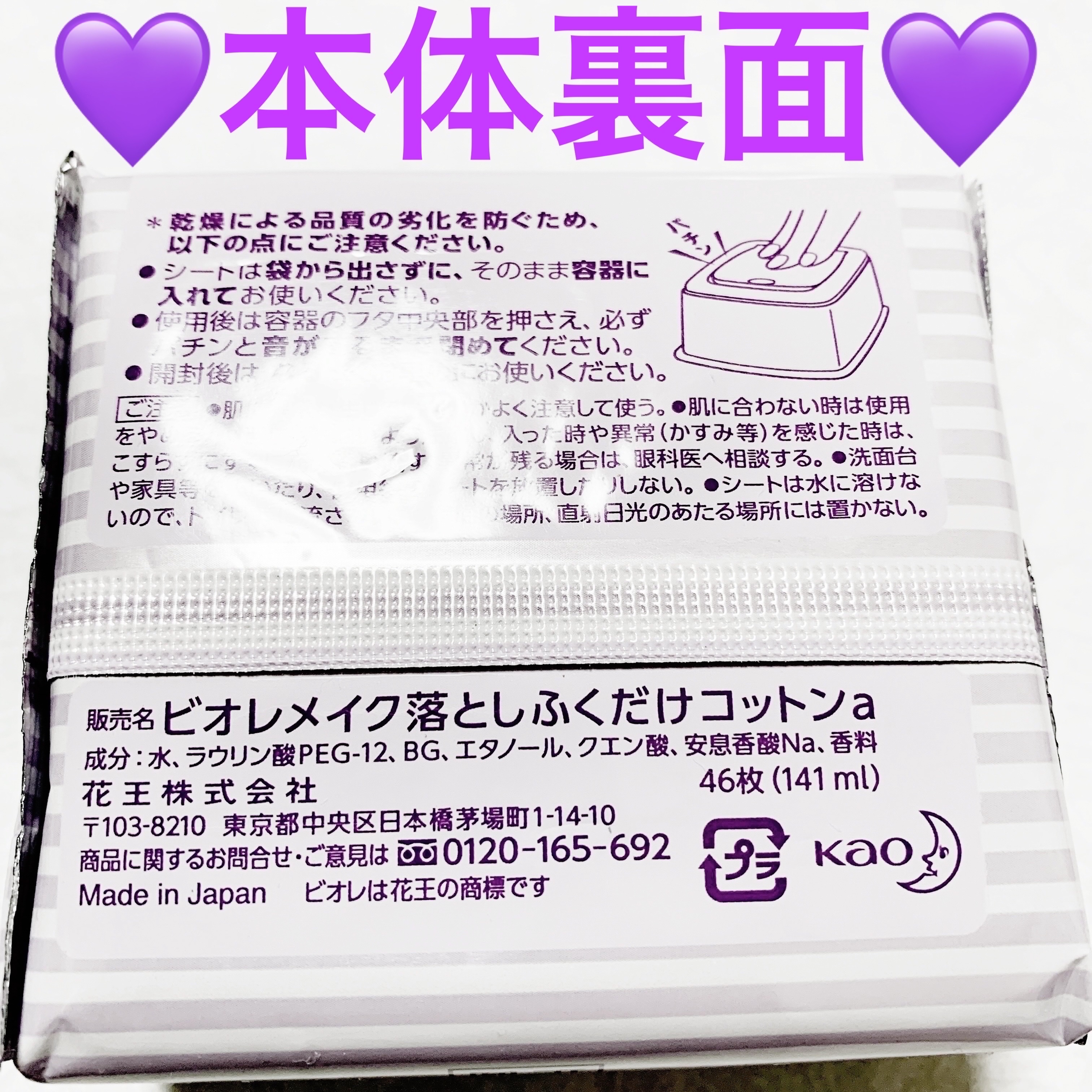- 毛穴に入ったファンデもすっきりオフ!シートタイプのメイク落とし。ふいた後しっとり。 化粧水成分*配合。そのまま寝てもつっぱらない。 ふきとった後の洗顔はいりません。ただし、ベタつきが気になる場合は洗い流してください。 天然コットン100%。やさしい肌あたり。 ●無着色・オイルフリー *BG(保湿成分)
