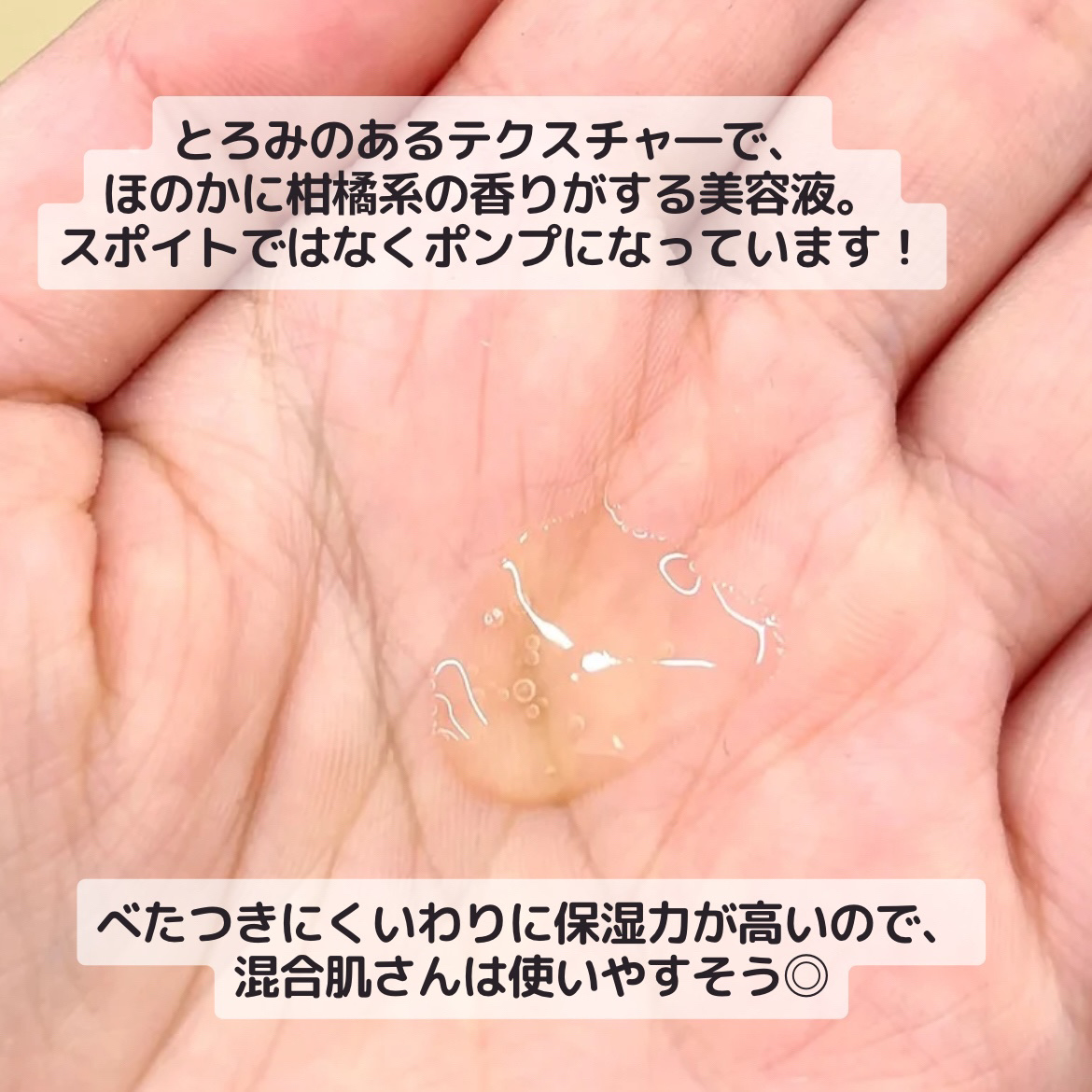 お気に入りポイント ☑のびのよいテクスチャー ☑サラッとしてべたつかない ☑柑橘の香り ☑コスパ◎ とろみ控えめのジェルは肌なじみがよくて、するするのび、べたつかないのが◎ そして、柑橘の香りがふんわりするのがお気に入りです🍋 保湿・ハリ成分のナイアシンアミドやビタミンC誘導体のアスコルビン酸なども配合しているので効果が高そう!
