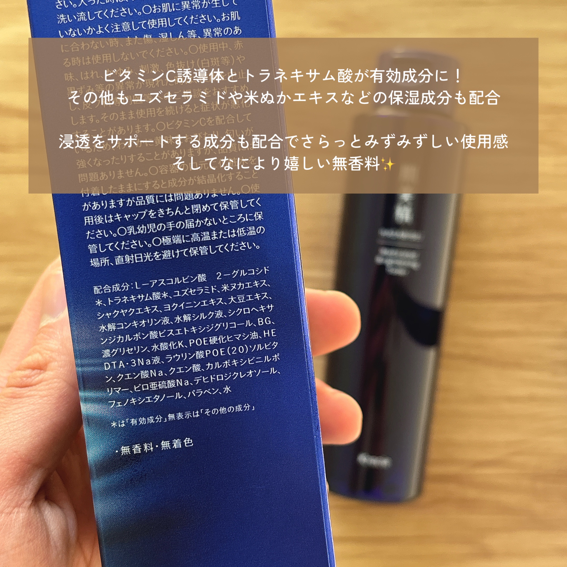 さらっとしたテクスチャーで肌馴染み◎でした! 無香料でクセもなく、使いやすいなと思いました! トラネキサム酸 乾燥・紫外線などの外部刺激による肌荒れを防ぐ 高濃度ビタミンC 角質層深くまで浸透、メラニンのもとにアプローチ。