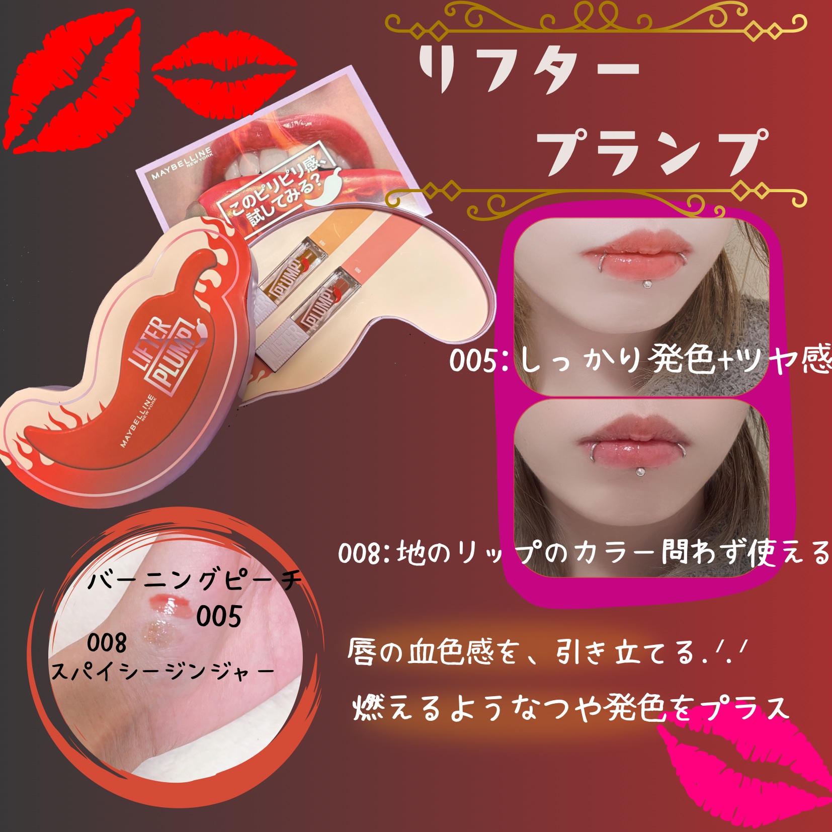 ほどよいピリピリがやみつきになること間違いなし?!求む!プランパー好きさん⸜(*ˊᵕˋ* )⸝ 005バーニングピーチはほんのりピーチの色味が可愛くてお気に入り!008スパイシージンジャーはほどよいラメ感でぷっくり感演出してくれる! プランパー初心者さんでも挑戦しやすい価格とピリピリ感なので、痛みが特別苦手じゃなければぜひお試しあれ⋆(՞ o̴̶̷̤ ̫ o̴̶̷̤՞)🌶️
