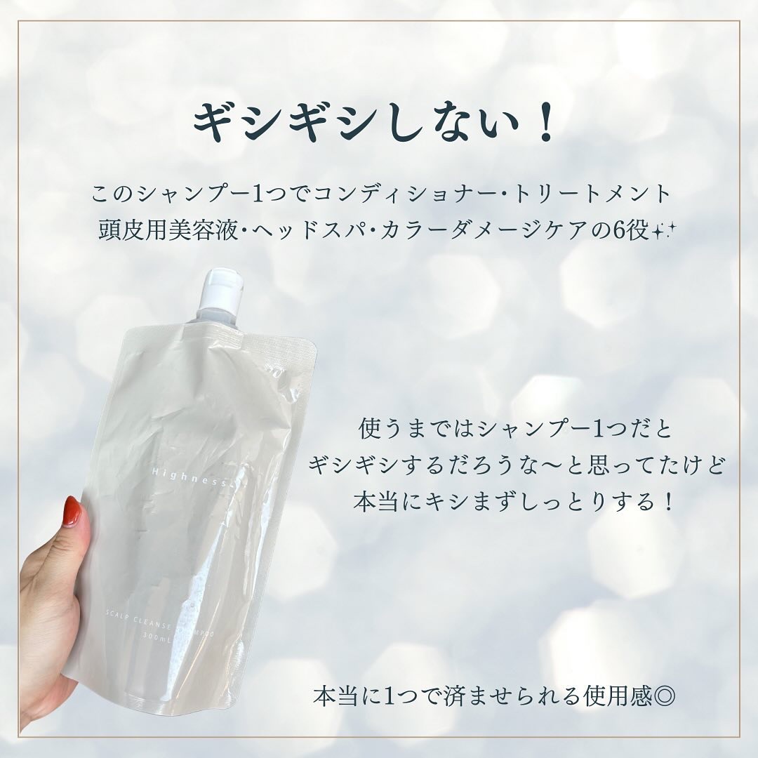 - 【医薬部外品】 ・頭皮美容液×シャンプーがひとつに!頭皮ケアしながら美髪を育てる シャンプーに頭皮美容液成分を配合することで、頭皮ケアと美髪ケアがシャンプーひとつで完結!頭皮臭・抜け毛・乾燥を防ぐ頭皮美容液の効果と、美髪を育てるシャンプーの効果がひとつで手軽に叶います。 -頭皮美容液のこだわり- 頭皮臭・抜け毛・乾燥など、頭皮ケアを目的とした美容液成分を配合。頭皮の炎症やかゆみ、乾燥を抑えてバリア機能をサポートする有効成分グリチルリチン酸2Kをはじめ、抜け毛ケアに優れたホップエキスなど、植物由来の成分が頭皮環境を整えます。 -シャンプーのこだわり- 髪や皮膚と同じアミノ酸系の洗浄成分を使用。地肌に優しく、刺激を与えません。 また、泡立ちにこだわった濃密泡が、奥まで入り込み不要な皮脂や汚れを吸着。潤いバランスを保ちながら、汚れをスッキリと洗い上げます。 さらに、天然由来の美髪成分を配合。まるで美容液で髪を洗っているような贅沢処方を実現しました。気になるうねり・パサつき・広がりをケアして、リンス&コンディショナー不要のサラツヤ髪へと導きます。 ・シルクエキス シルクのツヤと輝きの正体である被膜成分を高濃度で抽出したシルクエキスを配合。天然保湿因子が多く含まれ、髪1本1本にまるでシルク表面のようなツヤと潤いを与えコーティング。指通りの良いサラサラな髪へ。 ◇特徴02 ・天然由来成分98%!髪と頭皮に優しい、ナチュラル処方。 「Highness 薬用スカルプクレンズシャンプー」は98%が天然由来の成分で出来ています。 仕上がりの指通りと低刺激のどちらも叶う絶妙なバランスの調合で、髪と頭皮に負担なくキシまず髪に潤いとツヤを与えます。 さらに、刺激の強い添加成分は取り除いた安心のフリー処方。かゆみ等の頭皮トラブルが出やすい方にもおすすめです。 ◇特徴03 ・香水のように香りが変化する、ベルガモットローズの香り トップはベルガモットやオレンジが爽やかに、 次第にローズやジャスミンが華やかに香り立ちます。香水のように、移ろいゆく香りのグラデーションを楽しめるフレグランス仕様でバスタイムが楽しみに。