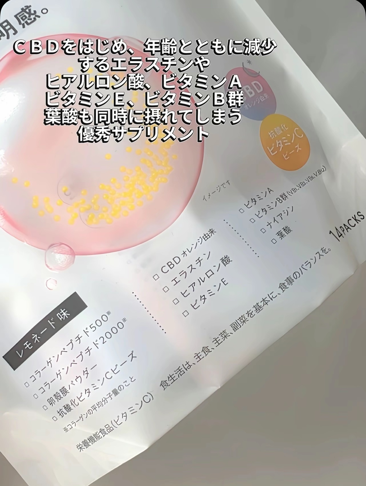 - サイズの異なるコラーゲンペプチドと、時間をかけてじっくり溶ける多重構造ビタミンCビーズを1包に詰め込んだ、キレイ習慣をサポートする栄養機能食品。多忙な毎日をサポートするアメリカで話題のCBDをはじめ、年齢とともに減少するエラスチンやヒアルロン酸、ビタミンA、ビタミンE、ビタミンB群、葉酸も同時に摂れます。 ●レモネード味●持ち運びに便利なスティックタイプ(そのまま飲んでも、水に溶かして飲んでも) 【栄養機能食品(ビタミンC)】ビタミンCは、皮膚や粘膜の健康維持を助けるとともに、抗酸化作用を持つ栄養素です。 ●本品は、多量摂取により疾病が治癒したり、より健康が増進するものではありません。●1日の摂取目安量を守ってください。●本品は、特定保健用食品と異なり、消費者庁長官による個別審査を受けたものではありません。●食生活は、主食、主菜、副菜を基本に、食事のバランスを。