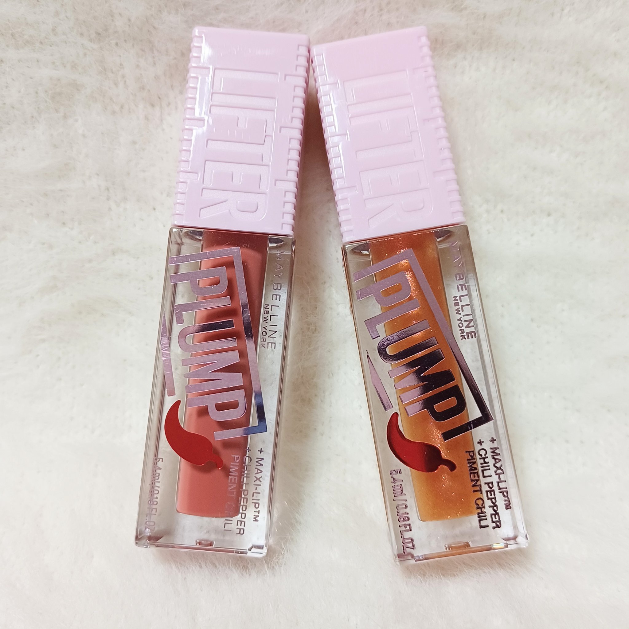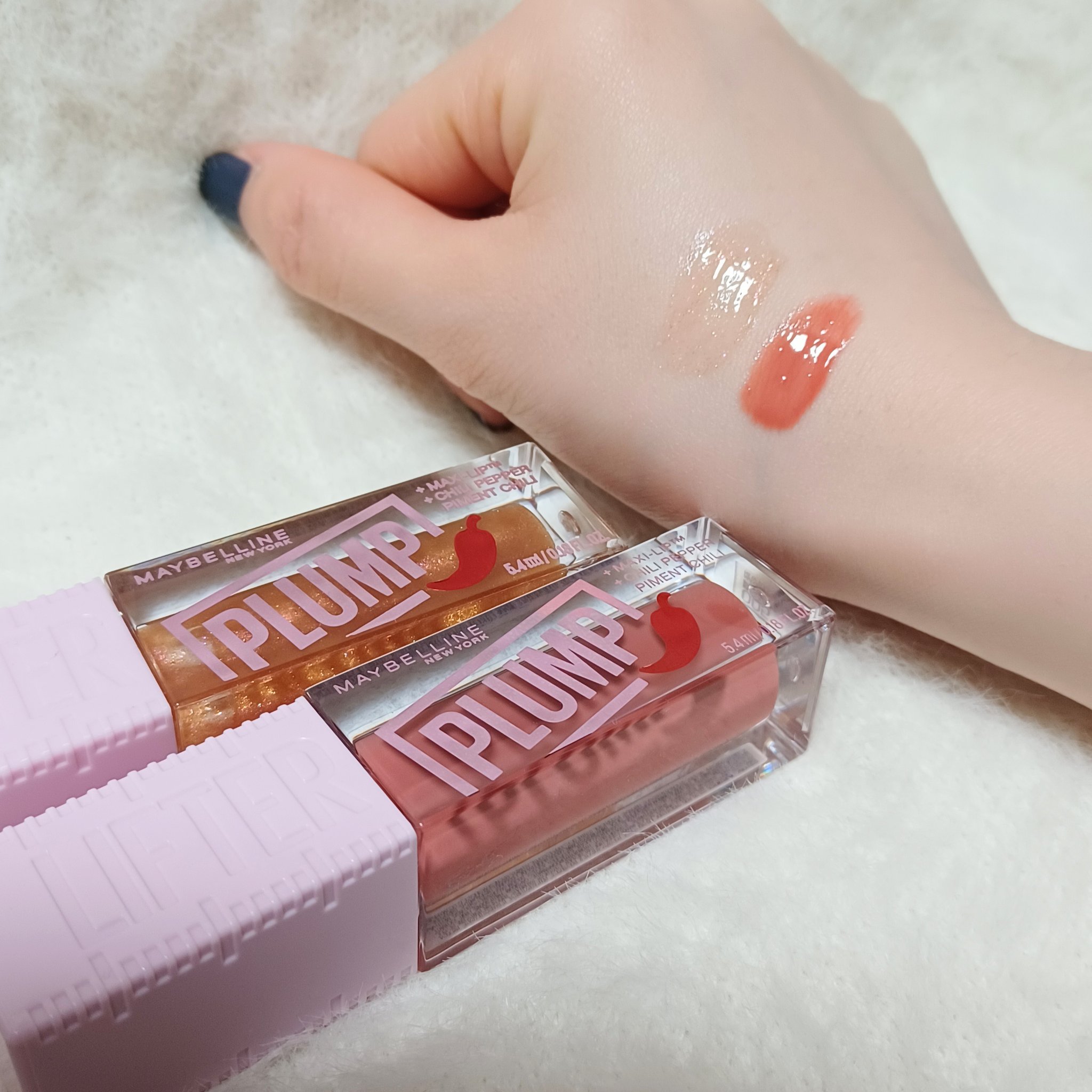 メイベリン ニューヨークの唐辛子リッププランパーが日本初上陸🌶🌶 プランプ効果と鮮やかな発色を兼ね備えたリッププランパーだよ🥹🩷 005バーニングピーチはしっかりと発色し、ツヤ感でこれ1本で綺麗な仕上がりに🍑 008 スパイシージンジャーは他のリップカラー問わず使えてラメのキラキラもかわいい✨