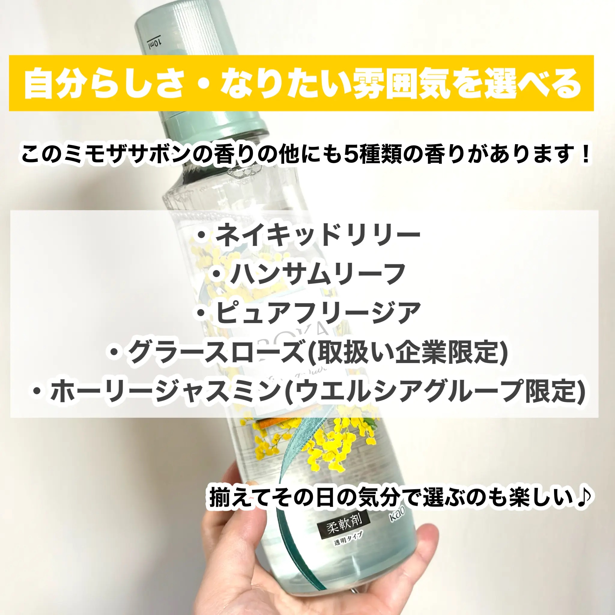- 香水のように香り高い プレミアム柔軟剤IROKA。 素肌のあたたかさを想わせる「ピュアムスク*1」と、 香水には欠かせない「高級アンバー」を贅沢*2に使用。 香水のように上質、なのに透明感あふれるその香りは、 あなたらしい美しさを、上品にさりげなく引き立てる。 25年2月に数量限定で、春に贈る幸せの花 清々しく香り立つ、ミモザサボンの香りが発売。 *1天然ムスク香気の主成分と同構造のl-Muscone *2当社柔軟剤比