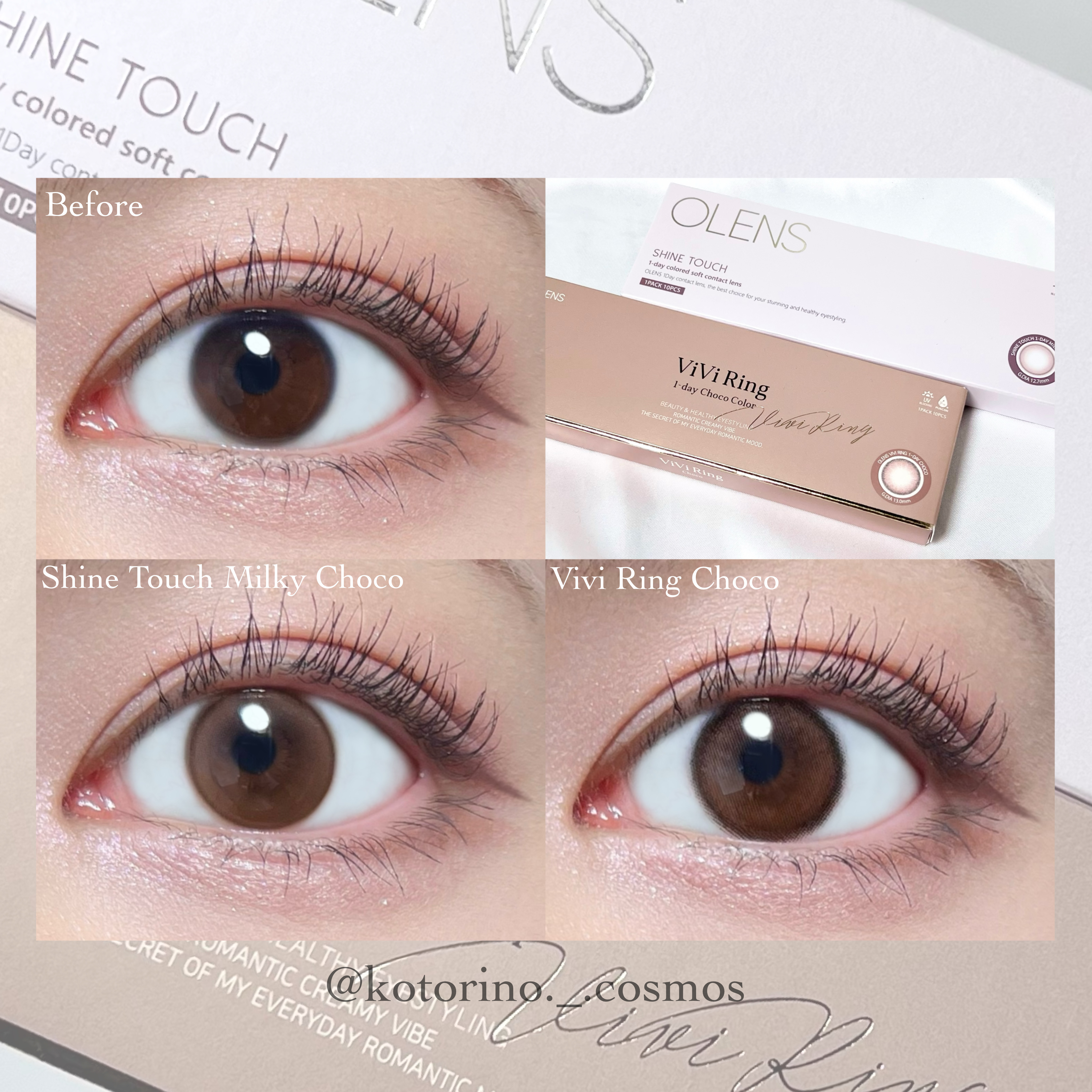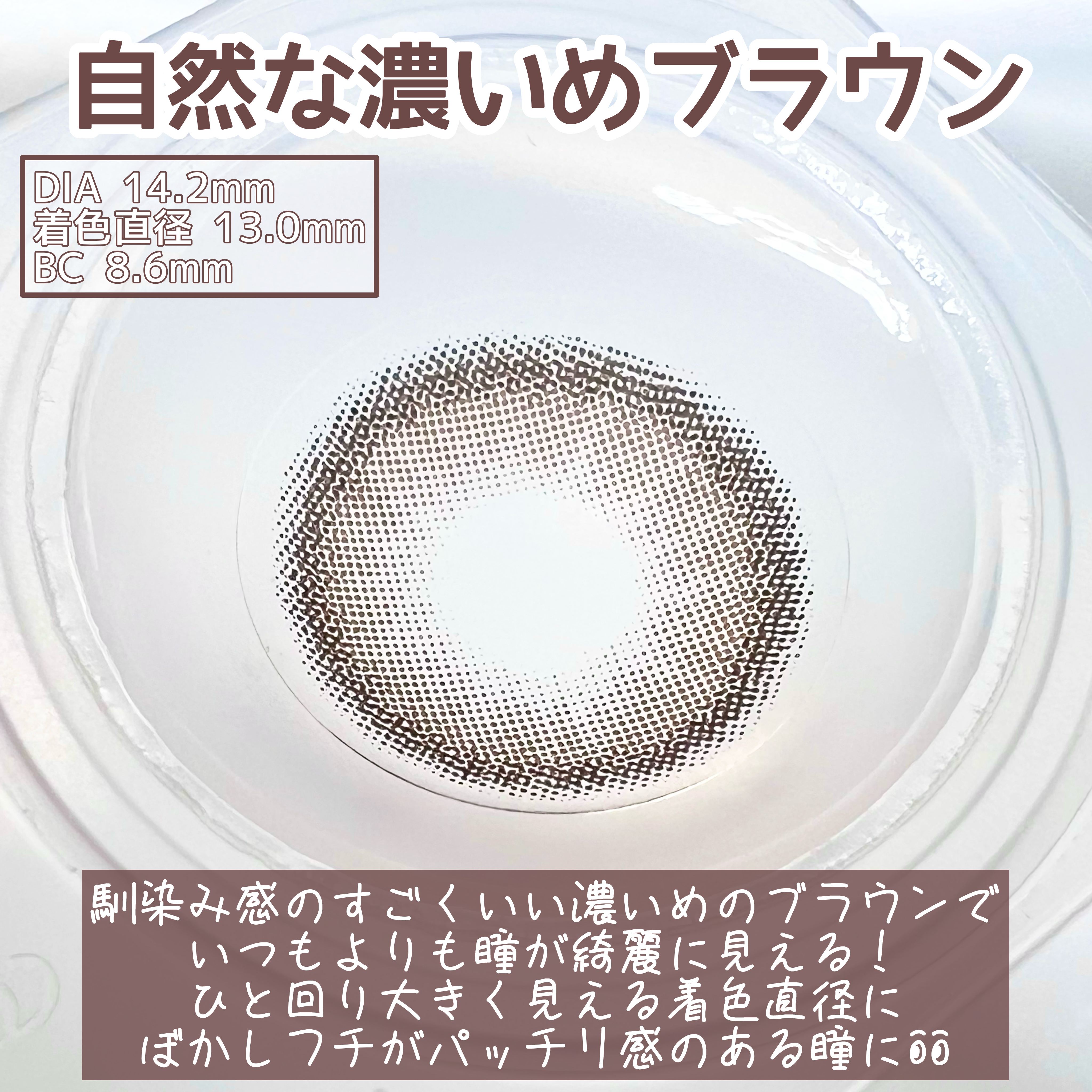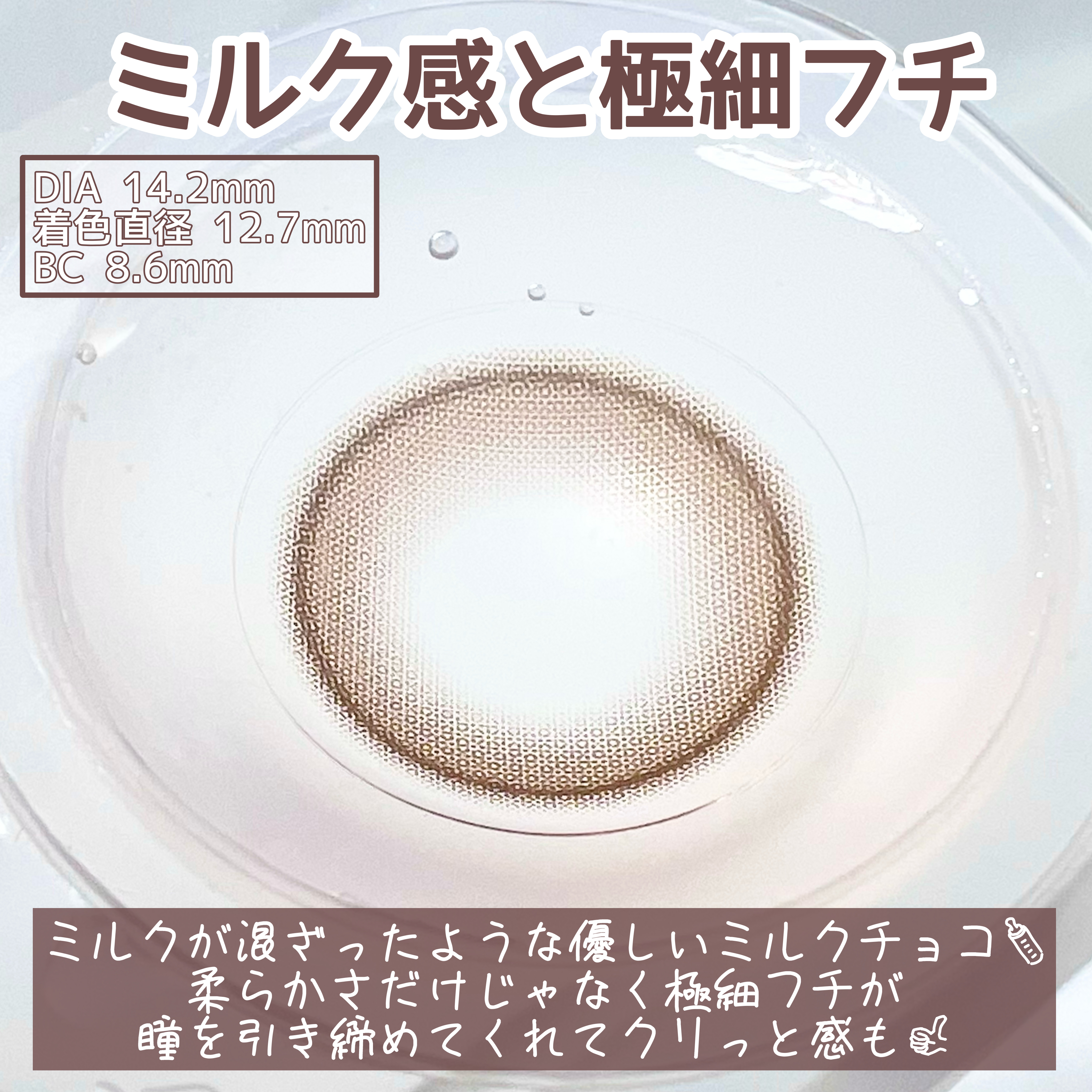 裸眼より可愛く、でも派手すぎないナチュラルなチョコカラーのカラコン🍫 ミルクを混ぜたような明るめの淡いブラウンで華やかな目元にしながらベースデザイン超えの極細フチで奥目にオシャレ度UP ツヤと透明感がたっぷりのふんわり馴染むカラー感瞳をはっきり見せてくれるぼかしフチ