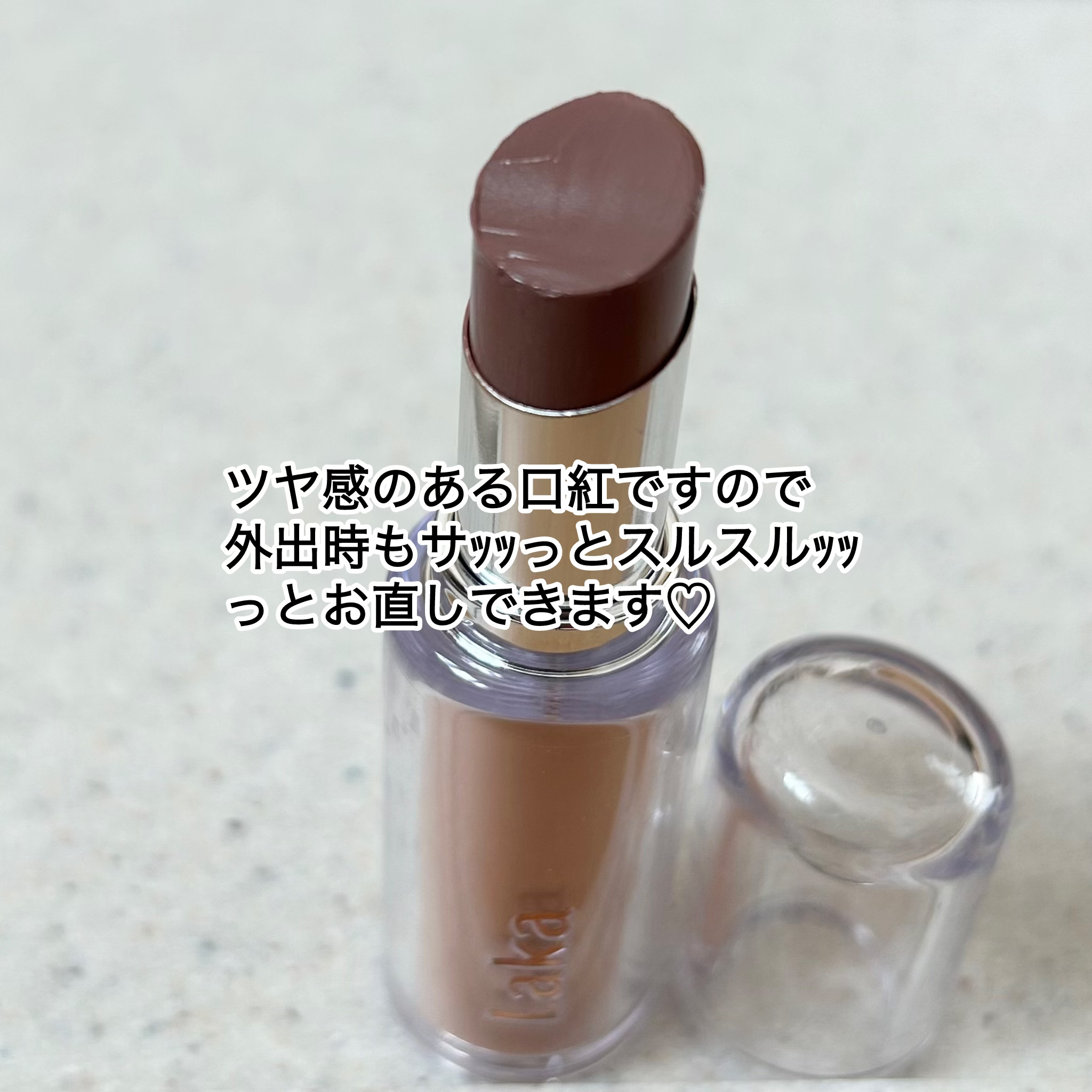 - Point1 透き通った気品が感じられるカラー ユニークなヌードカラーから自然なニュートラルカラー、深くて密度のあるポイントカラーまで、さまざまな好みに合わせた幅広いカラーバリエーション。それぞれのカラーが持つ明度や彩度に合わせて透明感を細かく調整しているため、グラデーションリップやオーバリップなど、プロが施したようなさまざまなリップメイクが楽しめます。また、夕方の暗い空間や、室内の光の下でも、唇本来の色にリップスティックのカラーが馴染み、水彩画のようなナチュラルな発色で、自然な血色感のある唇に演出します。 Point2 光に包まれたガラス玉のようなきらめき Lakaならではの「ボンディンググロウ」フォーミュラで、唇に触れた瞬間、体温でやさしく溶けていくようなテクスチャー。しっとりと馴染んで密着しながら唇をコーティングしてくれます。高い屈折率で光を強く反射させるハイシャインオイルコンプレックスを配合し、光沢感のある生き生きとしたリップカラーを実現しました。