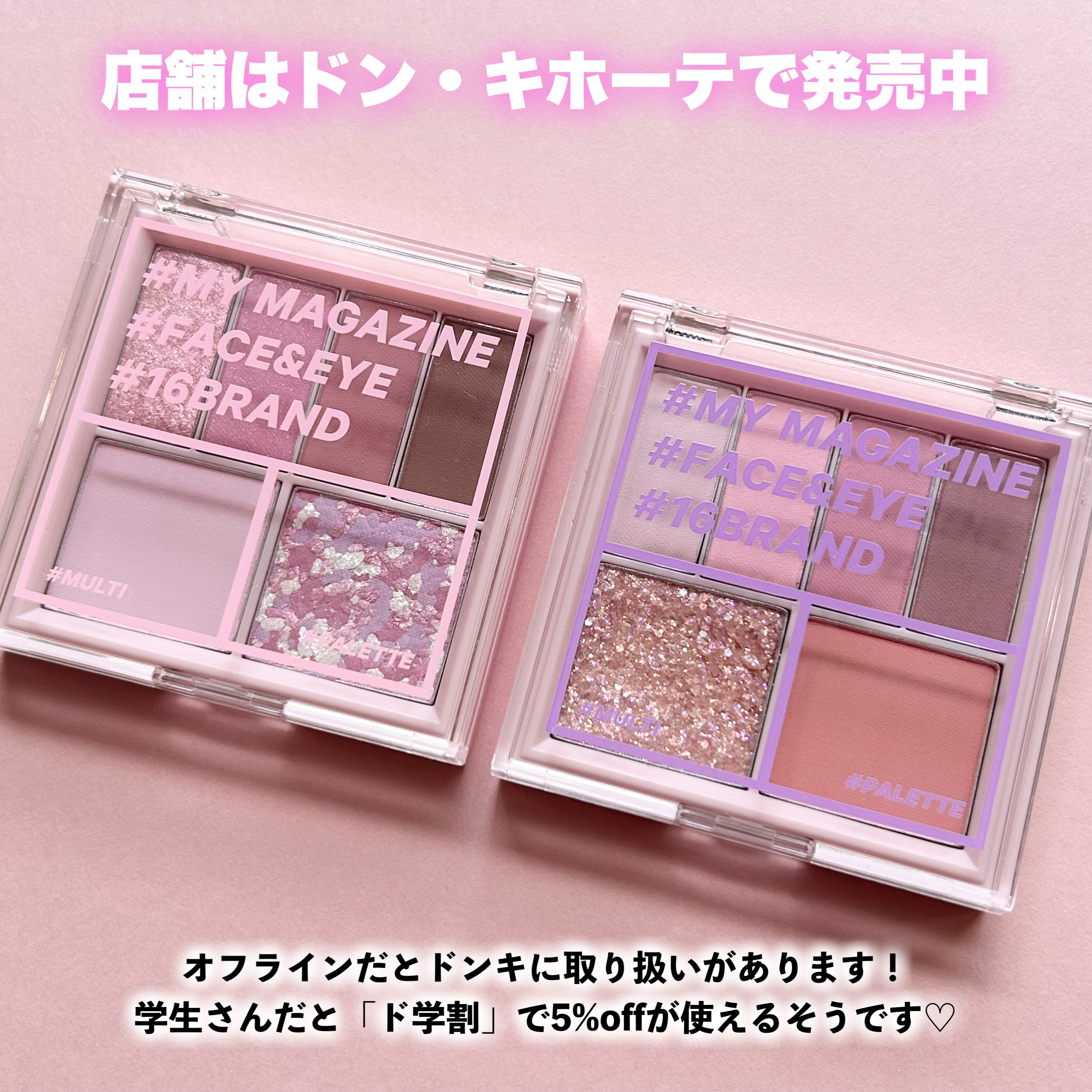 こちらのマルチパレットはドンキで購入可能!雑誌のような可愛らしいパケで、アイシャドウやチーク、アイブロウなどマルチに活躍してくれるパレットです🎨 しかも、学生さんならドンキの割引サービス「ド学割」があるようで、5%OFFで買えるんだとか🐸 発色は淡めで優しいふんわりとしてとても春らしく可愛いカラー展開なのも嬉しいですよね( 💓∀💓)