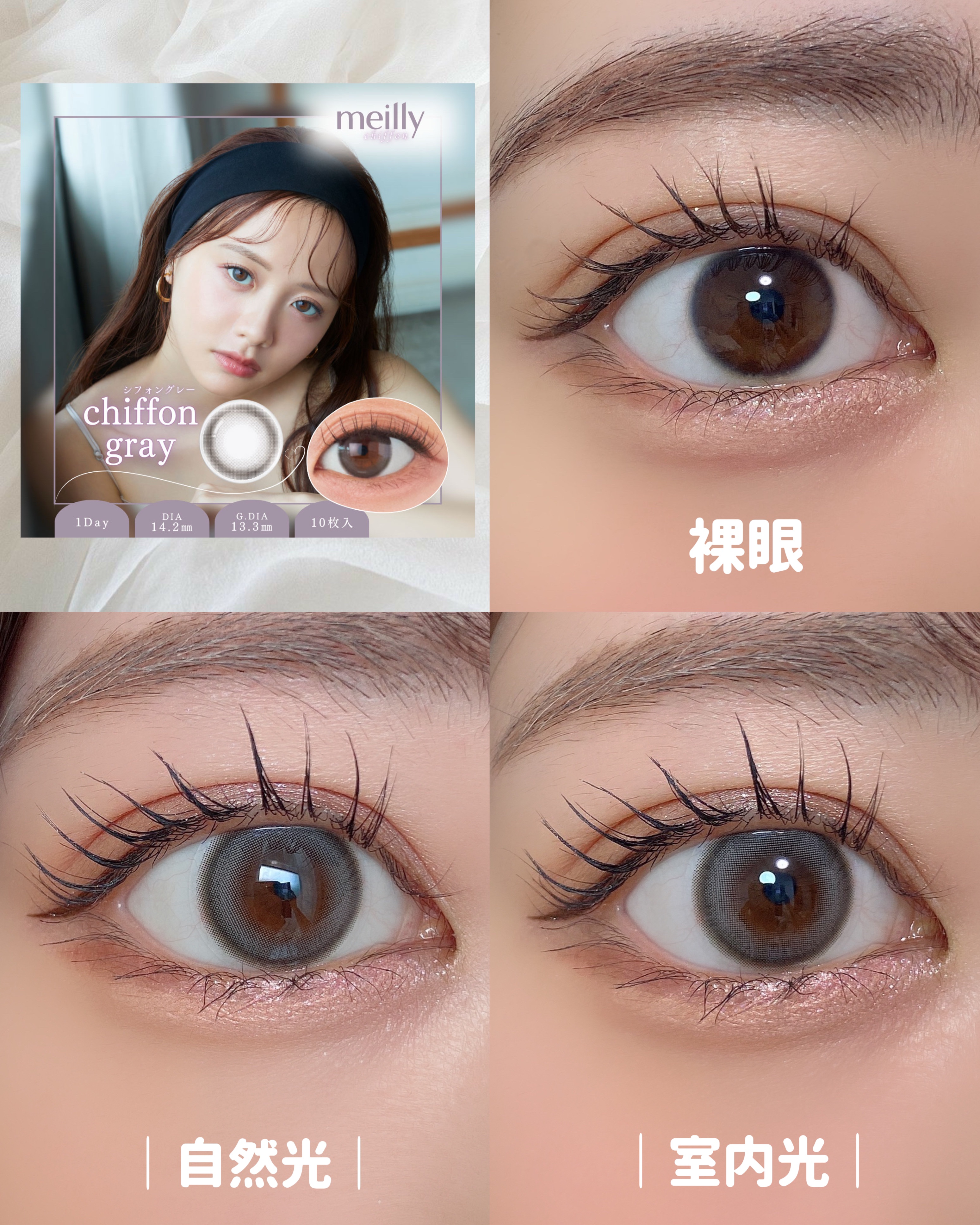 森香澄さんイメモカラコン🩷meillychiffonシリーズ💜瞳にシフォンドレスをかぶせたようなカラコン🥰自然なグラデーションぼかしフチで瞳に柔らかい雰囲気を🫶今回試してみたカラーはchiffongray🩶強すぎないグレーカラーだから、グレー...