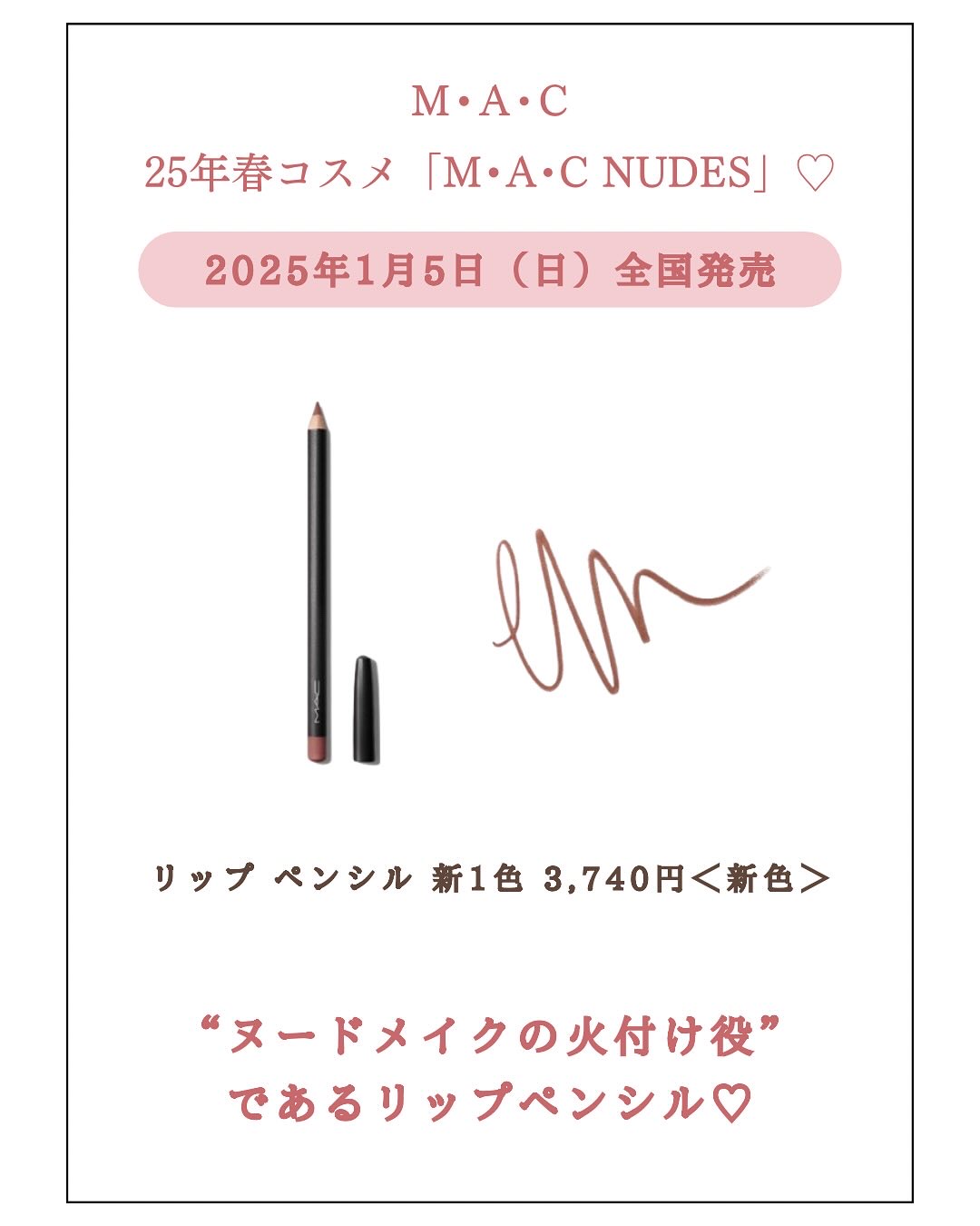 今回は、M•A•Cの新作 2025年春コスメ「M•A•C NUDES」 のアイテムをご紹介します💓 ブランドのDNAである“ヌードメイク”を楽しめます! ぜひチェックしてみてください✨ ◎メイクトレンド とろける塗り心地、落としたあとも続く潤い感、さらにどのリップカラーを選んでも、自分の肌の色から浮かない質感のリップを♡ ================= @cosme_m1yuでは、大人可愛いを目指せる コスメの最新情報をトレンド解説付きで紹介します! フォロー・いいね・コメント・保存お願いします♡ 最新情報をお楽しみに🫶🏻 ================= #新作コスメ情報 #新作コスメ紹介 #新作コスメ速報 #大人可愛いメイク #新作コスメ2025 #コスメトレンド #デパコス新作 #コスメ新作 #コスメ新作情報 #大人可愛い💕 #大人可愛い女子 #大人可愛いアイテム #大人女子メイク #大人女子になりたい #mac #maccosmetics #マックコスメ #mac新作コスメ #mac新作 #アイシャドウ #アイシャドウパレット #リップ #リップペンシル