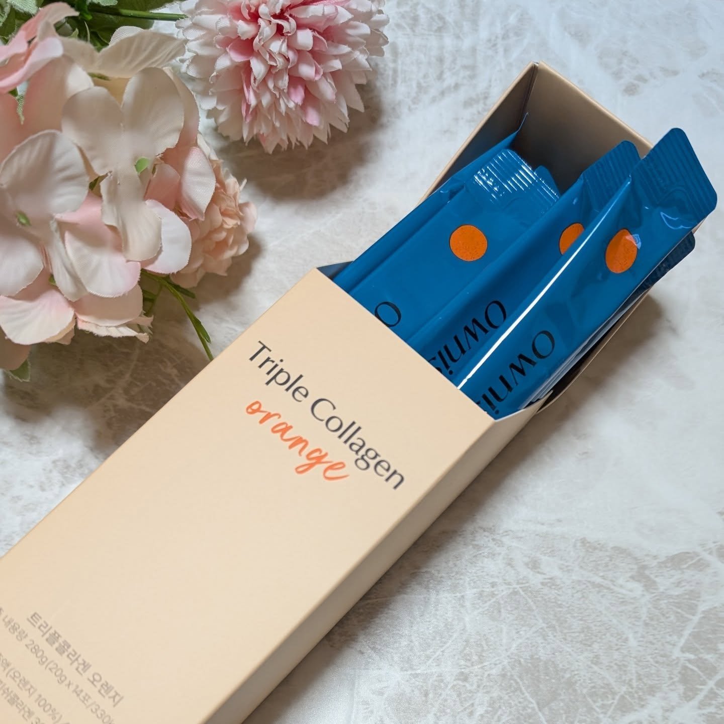 美味しいから毎日続けられる♡ Ownist トリプルコラーゲン オレンジ20g×14包入り スペイン・バレンシア産オーガニックオレンジを使用🍊 個包装になっていて水なしでも飲めるオレンジジュースみたいに濃厚で美味しい💐 持ち運びしやすいスティックタイプなので外出先でもすぐに飲めるのもポイント💡