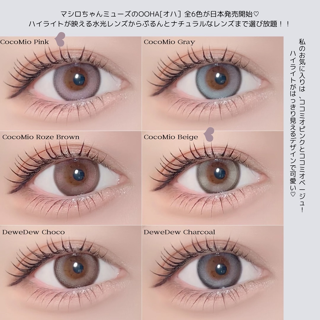 MADEINのMASHIROちゃんがミューズを務める韓国カラコンブランド 'OOHA(オハ)'全6種紹介🐈⬛🤍 OOHA 全6色 DIA14.2mm/GDIA13.5mm/BC8.6mm 2/1~PONPISH Qoo10販売開始 2/10~PONPISH本店、その他モール店 販売開始