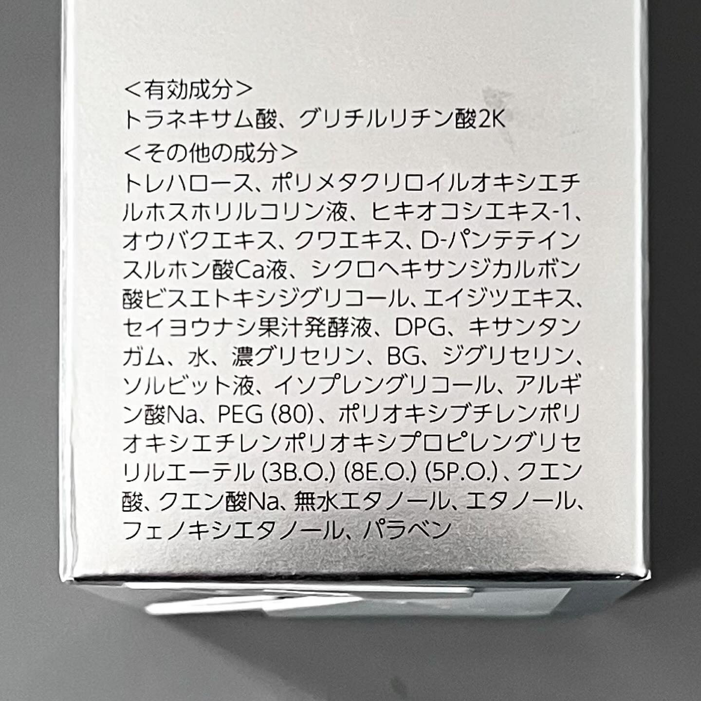 - <150ml> 有効成分 トラネキサム酸、グリチルリチン酸2K その他の成分 トレハロース、ポリメタクリロイルオキシエチルホスホリルコリン液、ヒキオコシエキス-1、オウバクエキス、クワエキス、D-パンテテインスルホン酸Ca液、シクロヘキサンジカルボン酸ビスエトキシジグリコール、エイジツエキス、セイヨウナシ果汁発酵液、DPG、キサンタンガム、水、濃グリセリン、BG、ジグリセリン、ソルビット液、イソプレングリコール、アルギン酸Na、PEG(80)、ポリオキシブチレンポリオキシエチレンポリオキシプロピレングリセリルエーテル(3B.O.)(8E.O.)(5P.O.)、クエン酸、クエン酸Na、無水エタノール、エタノール、フェノキシエタノール、パラベン <つめかえ用(140ml)> 有効成分 トラネキサム酸、グリチルリチン酸2K その他の成分 トレハロース、ポリメタクリロイルオキシエチルホスホリルコリン液、ヒキオコシエキス-1、オウバクエキス、クワエキス、D-パンテテインスルホン酸Ca液、シクロヘキサンジカルボン酸ビスエトキシジグリコール、エイジツエキス、セイヨウナシ果汁発酵液、DPG、キサンタンガム、水、濃グリセリン、BG、ジグリセリン、ソルビット液、イソプレングリコール、アルギン酸Na、PEG(80)、ポリオキシブチレンポリオキシエチレンポリオキシプロピレングリセリルエーテル(3B.O.)(8E.O.)(5P.O.)、クエン酸、クエン酸Na、無水エタノール、エタノール、フェノキシエタノール、パラベン