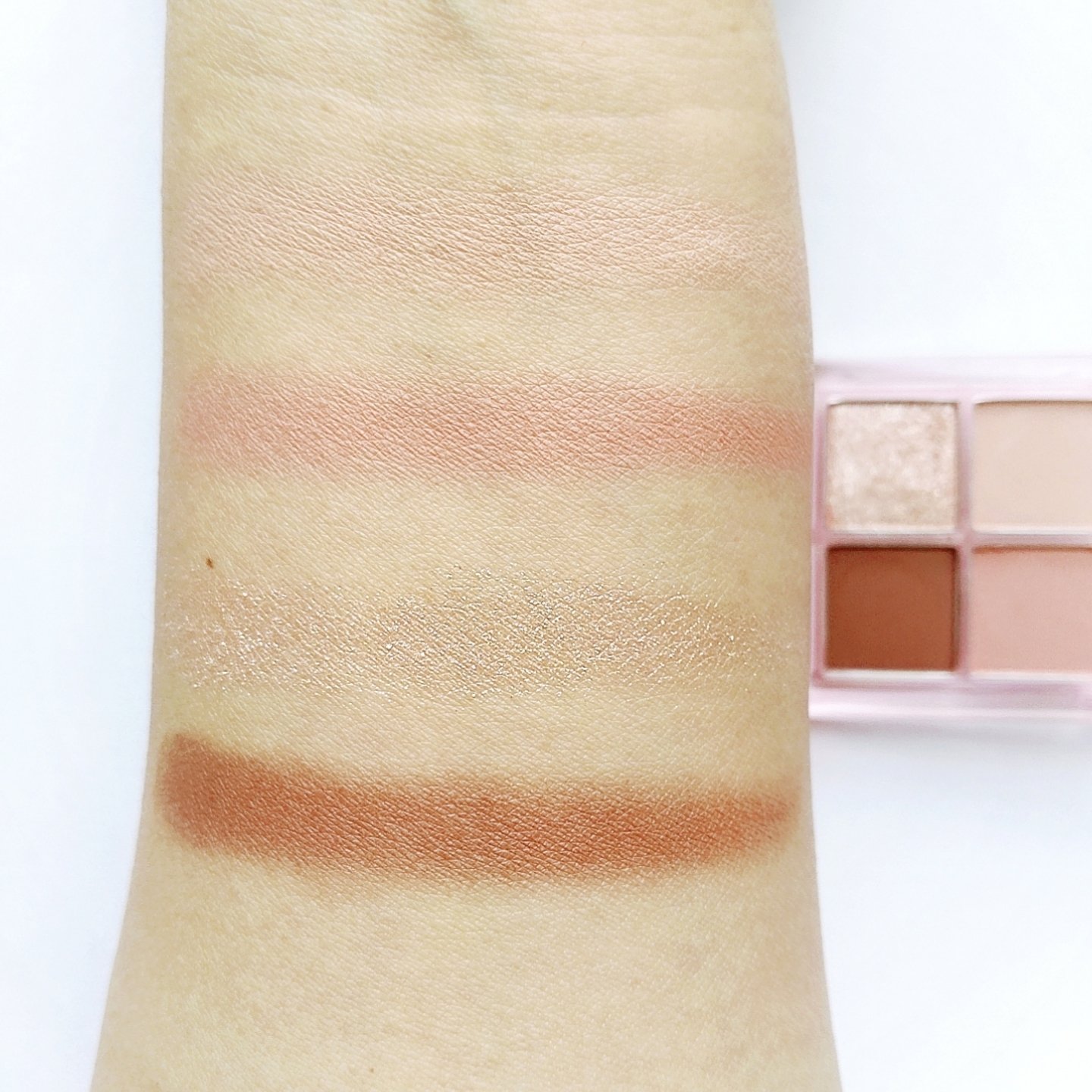 プチプラのクオリティじゃないっ!! 発売前からチェックしていたけれど、ここまで可愛いとは…😆 絶妙カラーで目もとのくすみを飛ばして*明るい印象に🩷 横割りグラデーションでメイクし、立体感をより出したかったので最後に1番左のカラーを上まぶたの真ん中と涙袋にのせています🙆 肌馴染みも良くて粉飛びも感じにくかったです💕 ブラウンの方も店頭に出てたら買おうかな💓