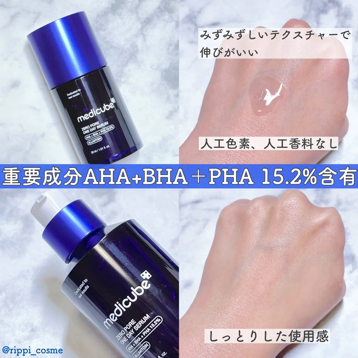 毛穴皮脂ケアに効果的なAHA+BHA+PHAが15.2%も含有 開き毛穴、黒ずみ毛穴、たるみ毛穴などに✨ ほんのりブルーカラー🩵 青色は自然由来成分のクチナシエキスによるものなんだって みずみずしいさらりテクスチャー しっとりとするような使い心地だよ